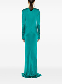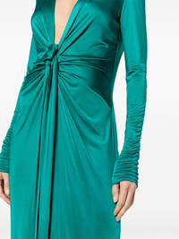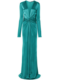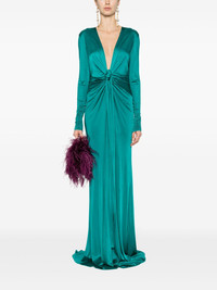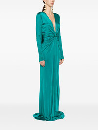 plunging concealedV-neck gown Elevated by a soft satin finish, this teal-green floor-length dress from Roberto Cavalli's SS24 collection boasts a plunging V-neckline and long sleeves. The front tie fastening allows for an adjustable fit. Highlights - Teal green - Plunging v-neck - Long sleeves - Cuff zips - Gathering at the hip - Floor-length - Front tie fastening - Concealed rear hook and zip fastening Made in Italy Composition Viscose 100% SIZE & FIT Model measurements Height 5 ft 9 in(1.76 m) Bust/Chest 33.07 in(84 cm) Hips 34.64 in(88 cm) Waist 25.59 in(65 cm)