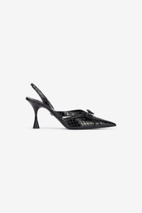 ID: UKS010-PZV97-D0056 A real homage to the distinctive Roberto Cavalli aesthetic, these slingbacks with flared mid-height heel are crafted from genuine leather with crocodile scale-effect embossing for a sumptuous, eye-catching aesthetic. The model features a pointed design and is decorated on the upper part with straps that create a cut-out effect and a matching bow that displays the signature Mirror Snake Monogram. Details - Leather slingbacks - Pointed-toe design - Crocodile scale-effect upper - Bow with Mirror Snake Monogram on the front - Straps that create a cut-out effect on the front - Elasticated ankle strap - Flared mid-height heel - Leather sole with Mirror Snake Monogram - Roberto Cavalli label on the insoles - Made in Italy Care & maintenance Lining:100% Capra hircus linneaus / Outer sole:100% Bos Taurus / Upper:100% Bos Taurus