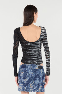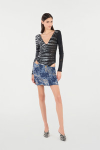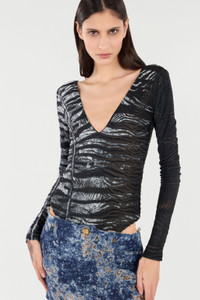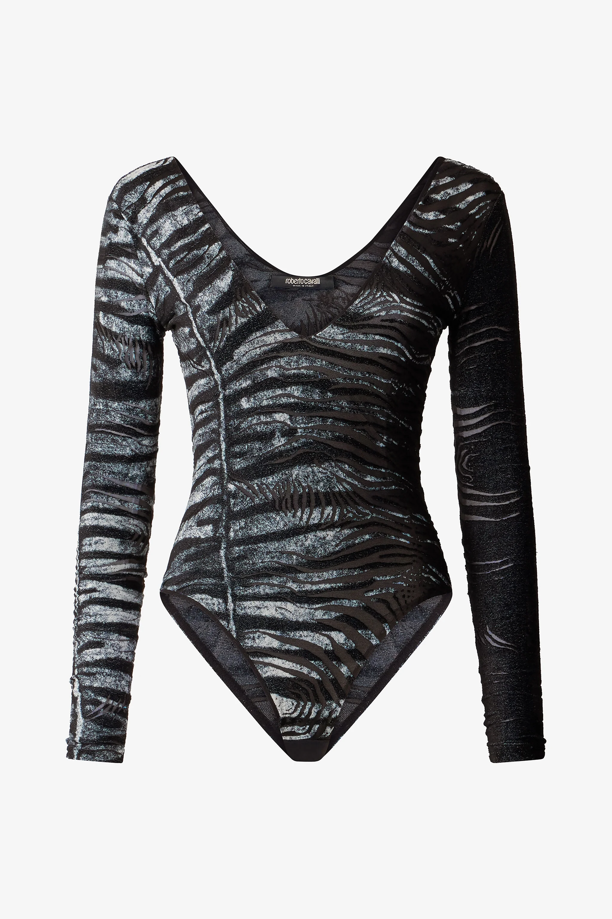 ID: UKT609-CPN50-D0146 Add a touch of wild elegance to your closet with this long-sleeved bodysuit from Roberto Cavalli featuring refined contrasting detailing. The protagonists of the piece are actually the iconic Zebra motif with a special terry effect on one half and the striking Tiger Skin motif on the other half, which give the texture a sensual see-through effect. Details - Long-sleeved bodysuit - Terry-effect zebra motif and see-through Tiger Skin motif - Plunging V-neck on the front - Deep round neckline on the back - Roberto Cavalli label on the inside collar - Made in Italy Care & maintenance External fabric:69% Viscose / Rayon, 31% Polyester / Lining:100% Polybutylene terephthalate