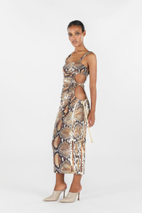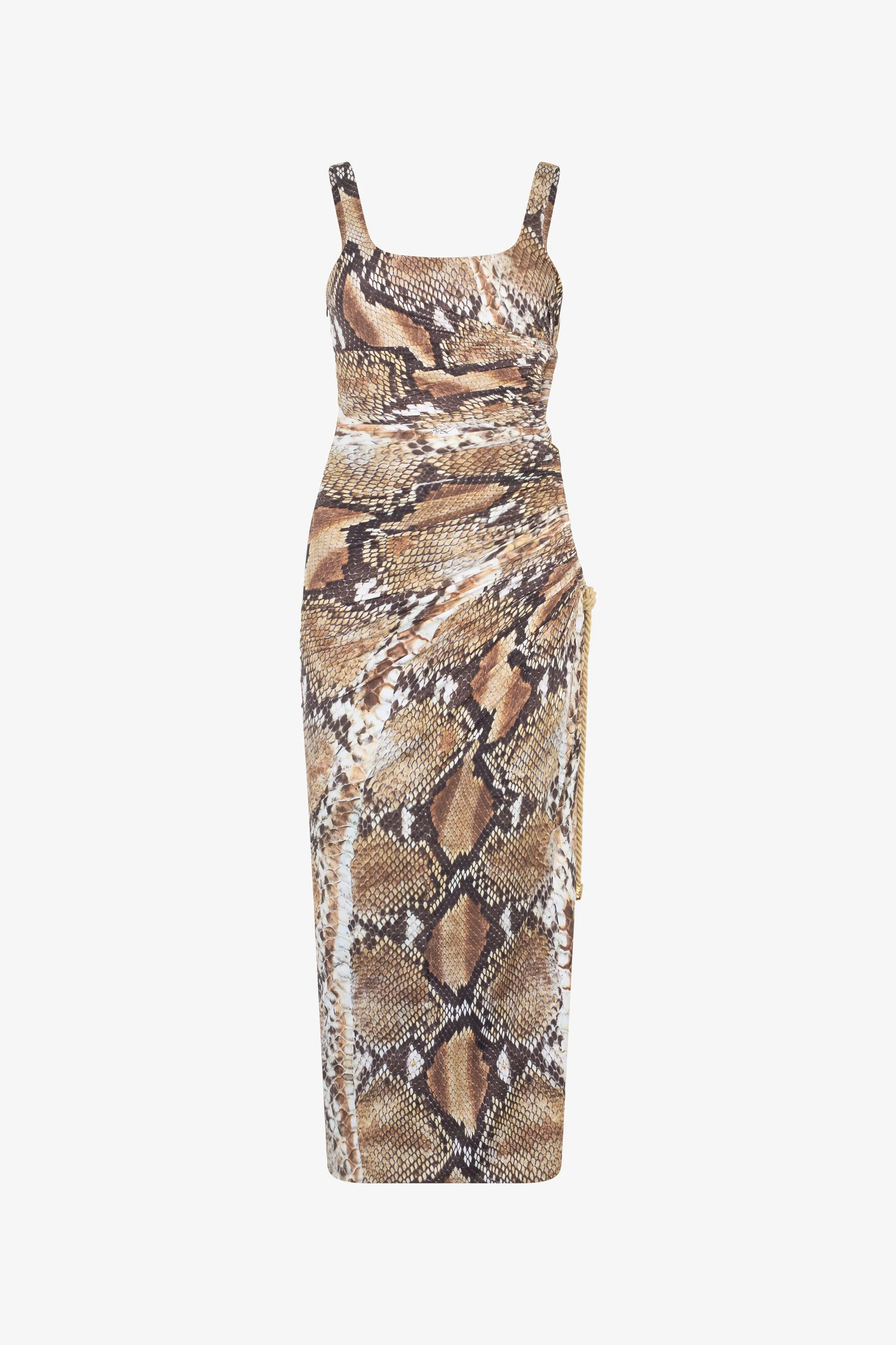 ID: UWT137-LNN93-J0256 This Python print midi dress embodies bold and sophisticated elegance. The fitted design highlights the silhouette, while the animal print adds a touch of wild luxury. The model is 178 cm tall and wears size S / 40. Details - Fitted design that enhances the figure - Distinctive Python print - Versatile and refined midi length - Made in: Italy - Ideal for special evenings or exclusive events, paired with high heels and minimalist accessories.