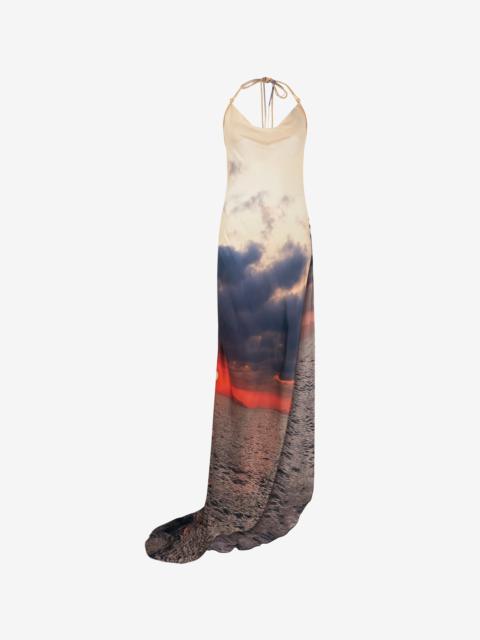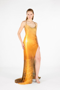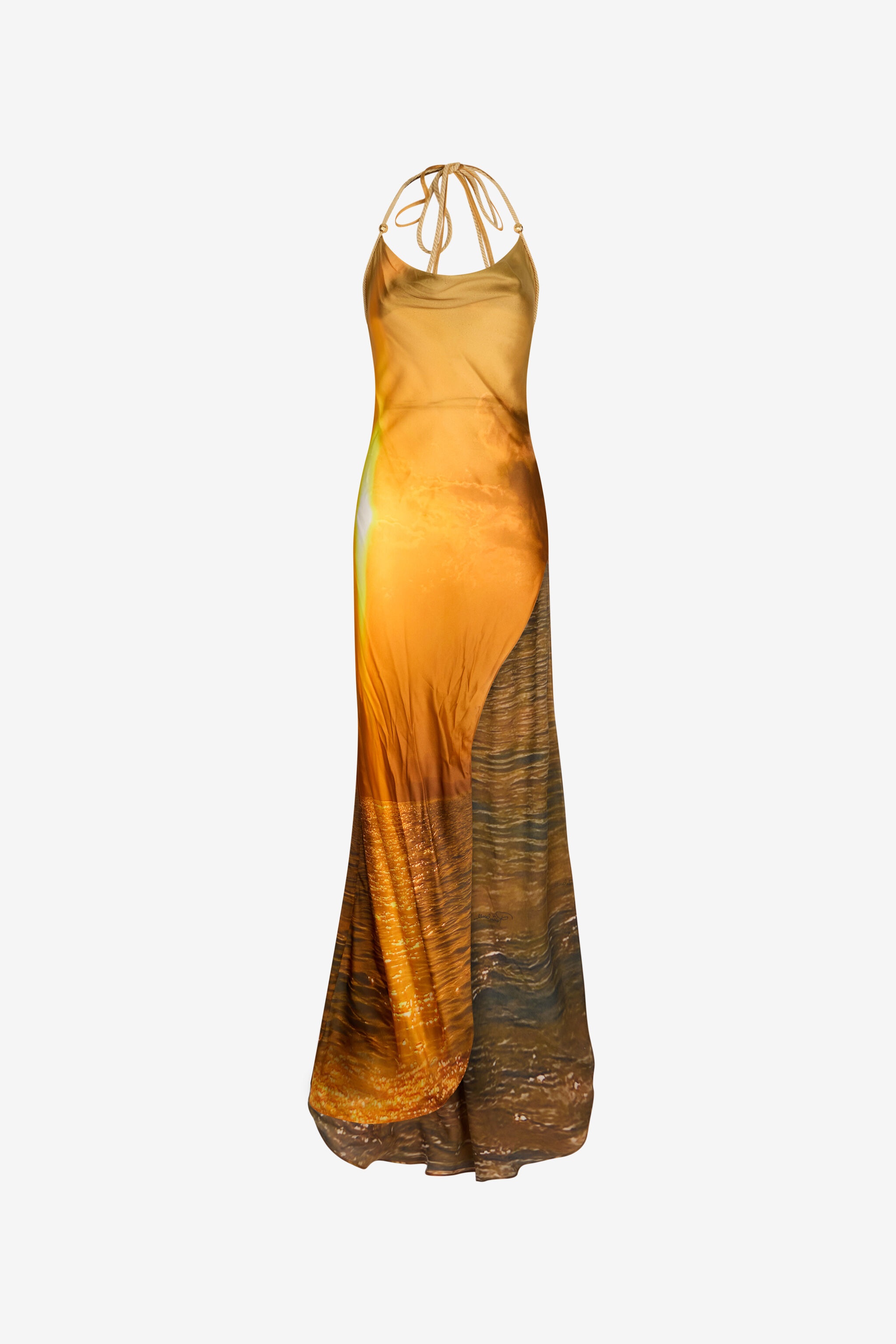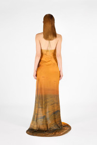 ID: UWT125-CTN97-09231 An ode to the sunset, this Sunset print long dress captures the essence of a twilight landscape. The design with side slit adds a touch of sensuality, while the thin straps and draped neckline enhance the silhouette. The model is 178 cm tall and wears size S / 40. Details - Elegant and refined design - Side slit for a bold look - Draped neckline that enhances the decollete - Made in: Italy - Ideal for evening events, special occasions or glamorous evenings - It is recommended to combine it with minimal accessories to enhance the print Care & maintenance External fabric:100% Silk