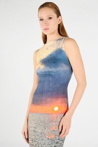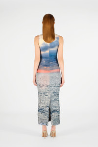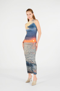 ID: UWT109-4QN96-05144 The long dress with Sunrise print captures the essence of a serene dawn, transforming a moment of stillness into a haute couture garment. The fitted fit enhances the silhouette, while the print evokes a sense of magic. The model is 178 cm tall and wears size S / 40. Details - Figure-hugging design that enhances the silhouette - Exclusive Sunrise print - Sleeveless for a sophisticated look - Made in: Italy - Ideal for evening events and special occasions - Perfect paired with high heels and minimalist accessories Care & maintenance External fabric:100% Silk / Secondary fabric:100% Silk