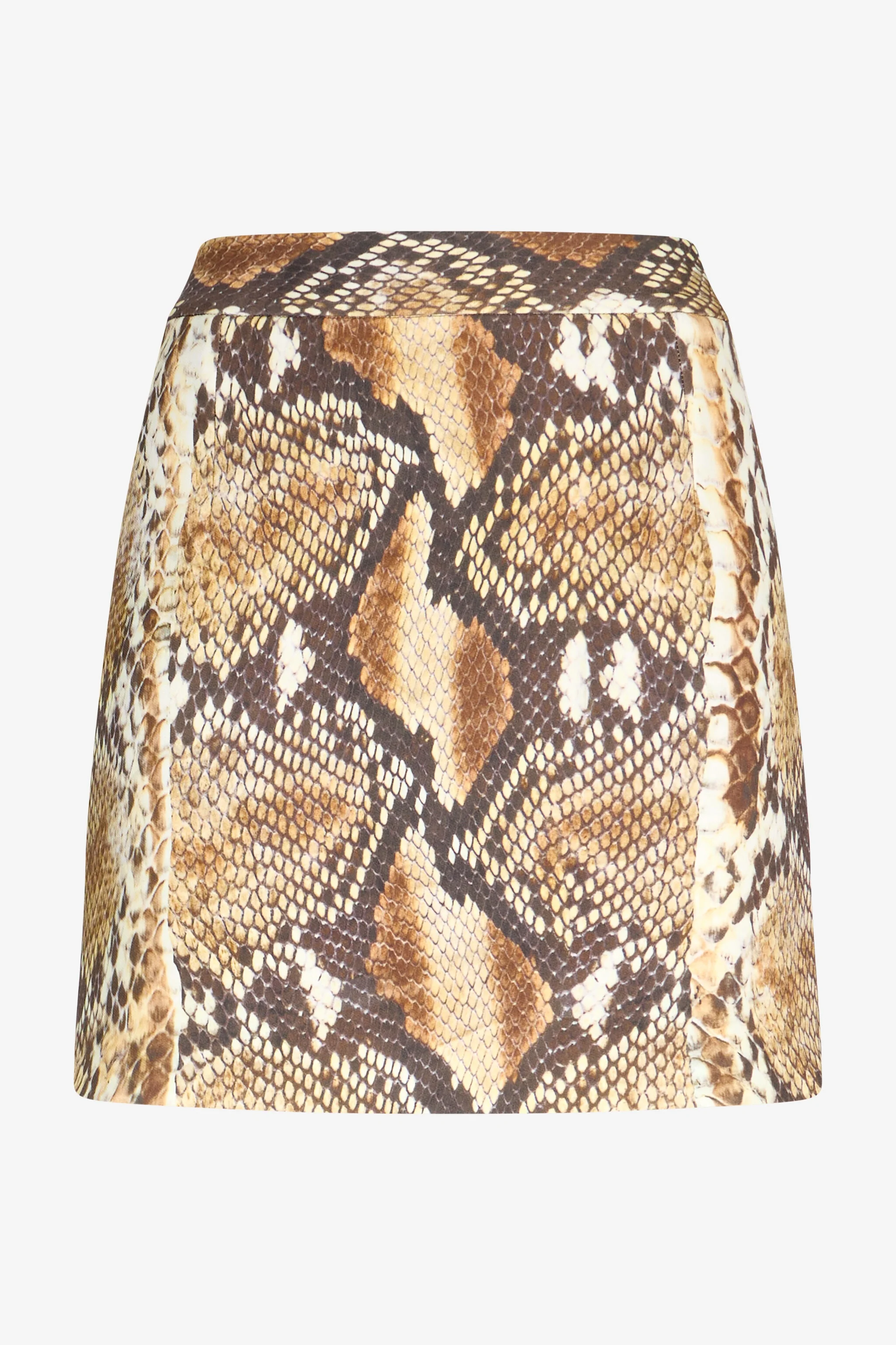 ID: UWT308-ORN93-J0256 This Python print mini skirt will add a bold touch to your wardrobe. Its eye-catching design makes it perfect for creating unique and trendy looks. The model is 178 cm tall and wears size S / 40. Details - All-over Python print - Mini design - Invisible zip closure - Made in: Italy - Perfect for evenings and special occasions - Match with a blouse or a jacket Care & maintenance External fabric:57% Viscose / Rayon, 40% Polyester, 3% Elastane / Lining:100% Viscose / Rayon