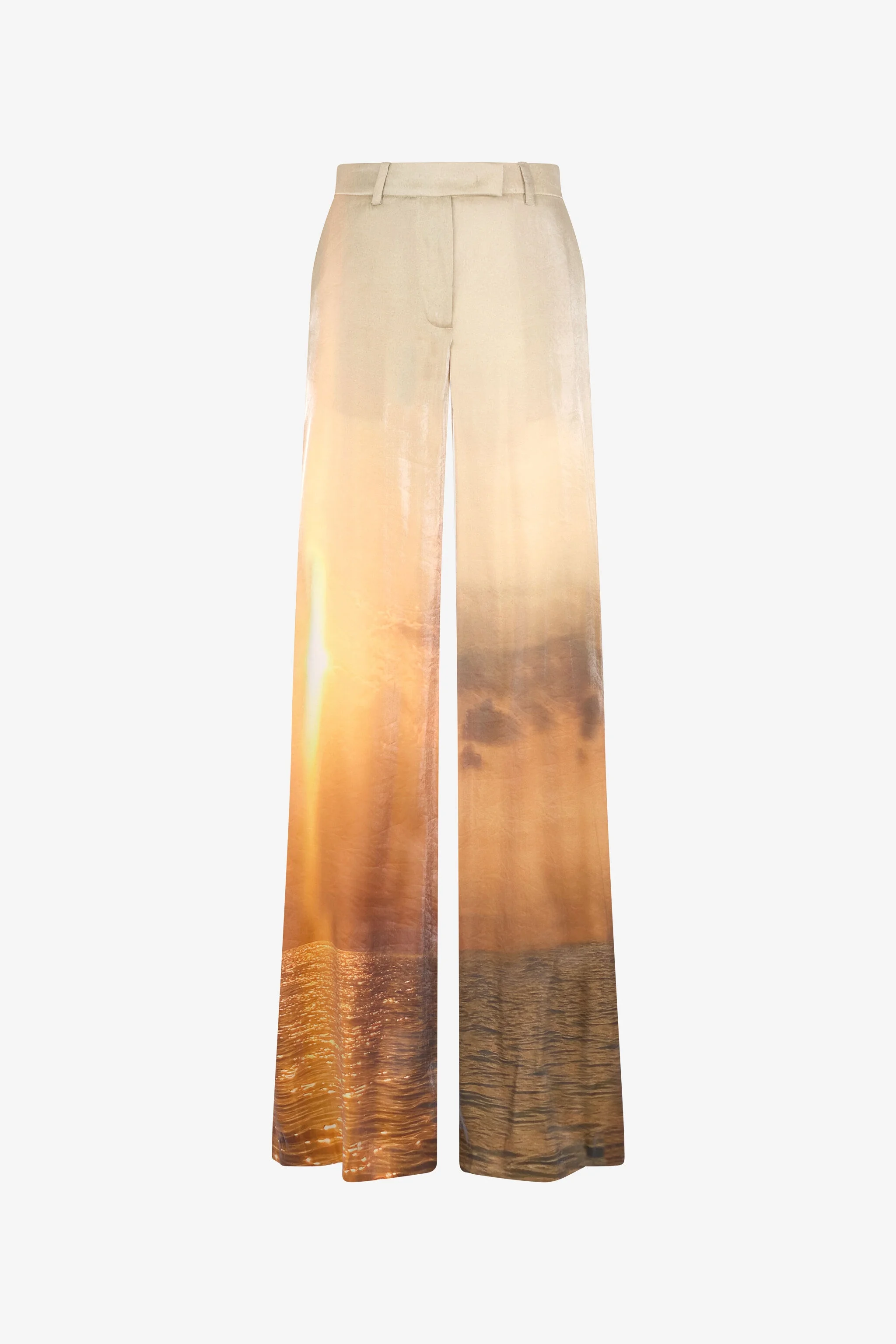 ID: UWT201-OQN97-09231 The Sunset print palazzo trousers capture the essence of a golden sunset, offering a garment that is both a work of art and a luxury item. Its fluid and wide silhouette gives a timeless elegance. The model is 178 cm tall and wears size S / 40. Details - Palazzo trousers with high-quality digital print - Shaped waistband for an optimal fit - Front closure with invisible zip and hook - Made in: Italy - Ideal for evening events, special occasions or for a sophisticated daytime look - Pairs perfectly with a silk shirt or a minimalist top for an elegant outfit