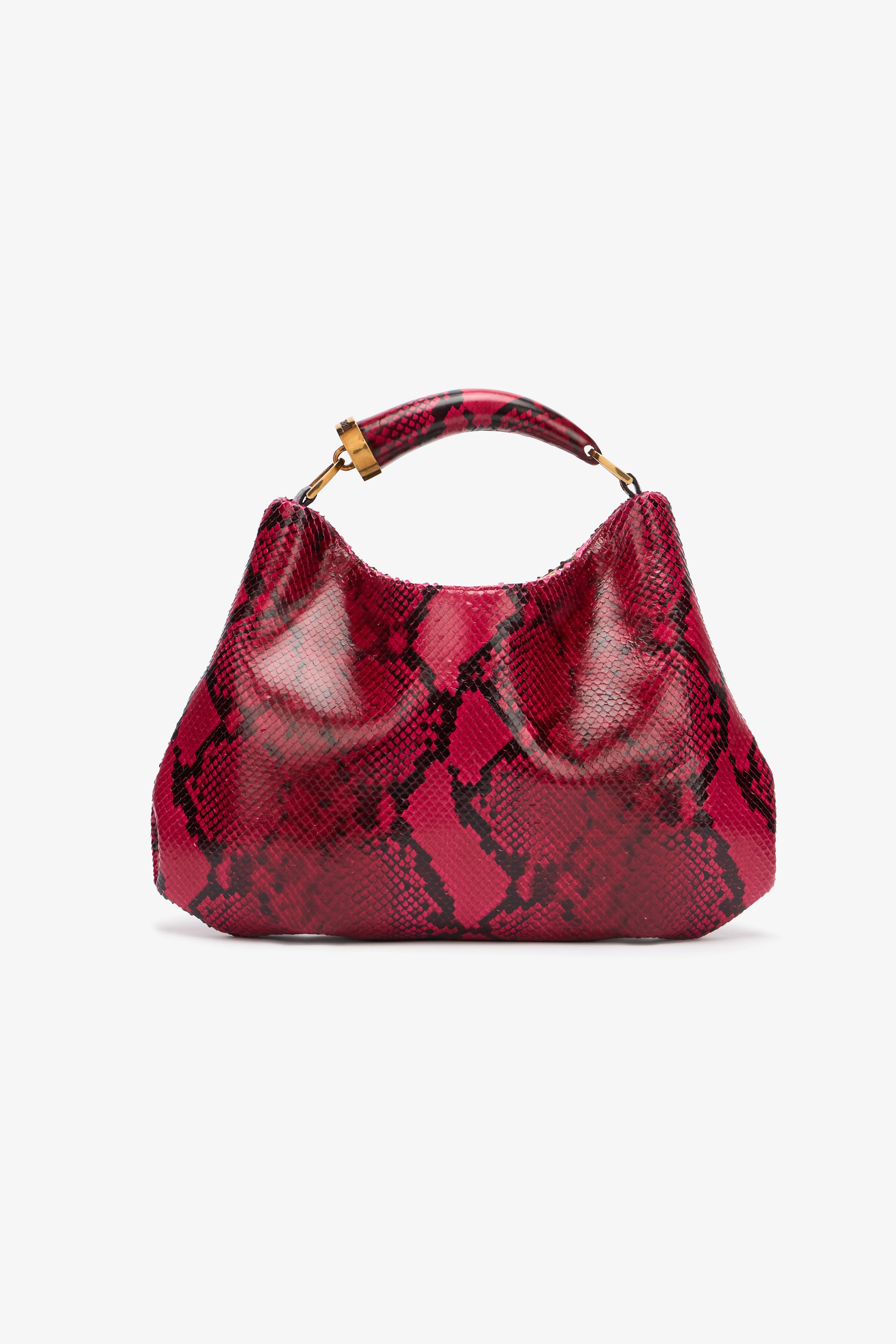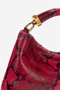 ID: TKB009-PZP02-D1007 Crafted from leather with the iconic python scale-effect print, this large hobo bag is enhanced with a vibrant hue and one of the most recognizable details of the Roberto Cavalli aesthetic: the tiger Fang, here in the form of a matching handle. Details - Python scale-effect leather hobo bag - Large size - Fang-shaped handle - Cotton-blend lining Care & maintenance Leather - Fur:Bos Taurus / Lining:97% Cotton, 3% Elastane
