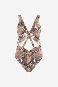 ID: UWW001-HVO87-J0256 Bold elegance for your beachwear with this Python print one-piece swimsuit. A refined design that enhances the silhouette, perfect for those who want to stand out with style. The model is 178 cm tall and wears size S / 40. Details - Design with front interweaving - Deep neckline - Wide straps for optimal comfort - Made in: Italy - Ideal for a sophisticated beach or poolside look - Perfect paired with light cover-ups and gold accessories