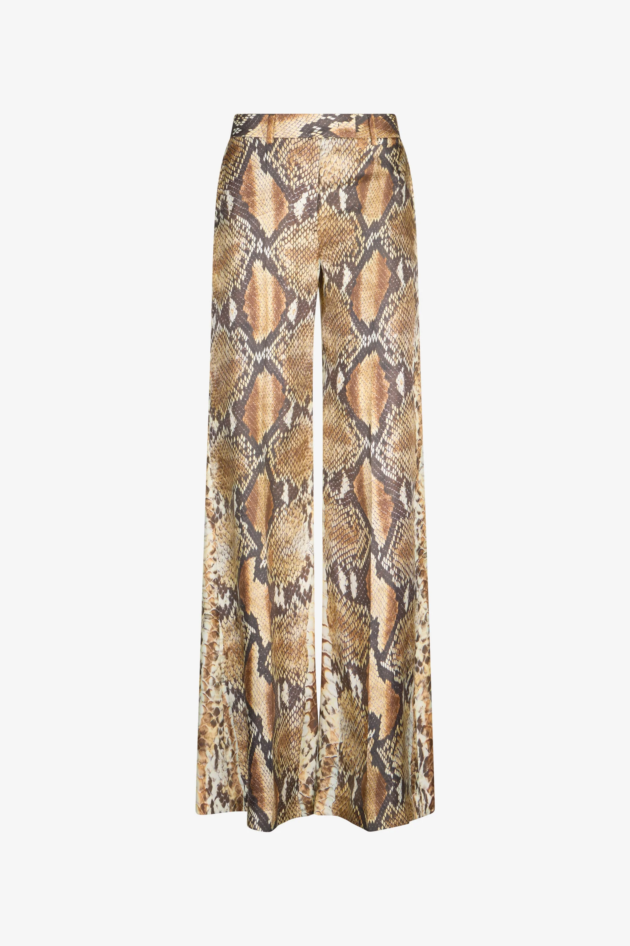 ID: UWT201-4QN93-J0256 Bold and sophisticated elegance merges in these Python print trousers. A distinctive garment that captures attention, perfect for those who love to dare with style. The wide and fluid fit guarantees comfort and freedom of movement, enhancing the silhouette. The model is 178 cm tall and wears size S / 40. Details - Wide leg design - High waist - Zip and hook closure - Made in: Italy - Ideal for an evening look or a special event - To be combined with a flowing shirt or a tight top Care & maintenance External fabric:100% Silk
