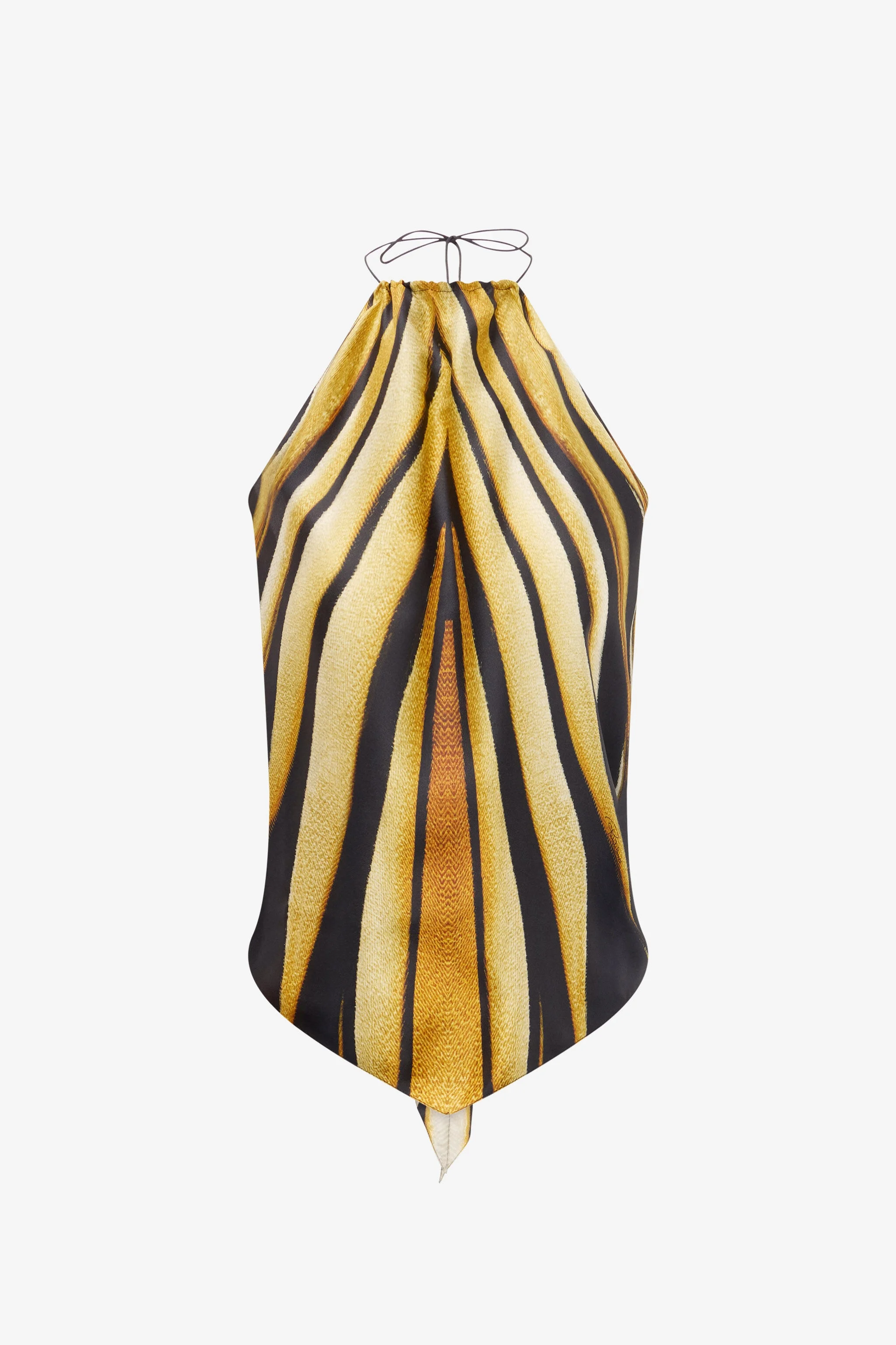 ID: TKT601-4QM33-01080 Embodying vibrant energy, this halter top is adorned with the dynamic Ray of Gold print. Crafted from pure, fluid silk, the design elegantly drapes the figure, featuring slim ties that fasten behind the neck and across the open back, creating a sophisticated and bold silhouette. A piece that captures the essence of Roberto Cavalli glamour, perfect for those who aren't afraid to stand out. The model is 178 cm / 5'10" tall and wears size S / 40 IT. Details - Halterneck top design - Crafted from luxurious 100% silk twill - Features the bold all-over Ray of Gold print - Adjustable tie closures at the neck and back - Sleeveless design with an open back - Ideal for cocktail parties or elegant evenings - Pair with coordinating trousers or a solid-colour skirt for a complete look - Made in Italy Care & maintenance External fabric:100% Silk