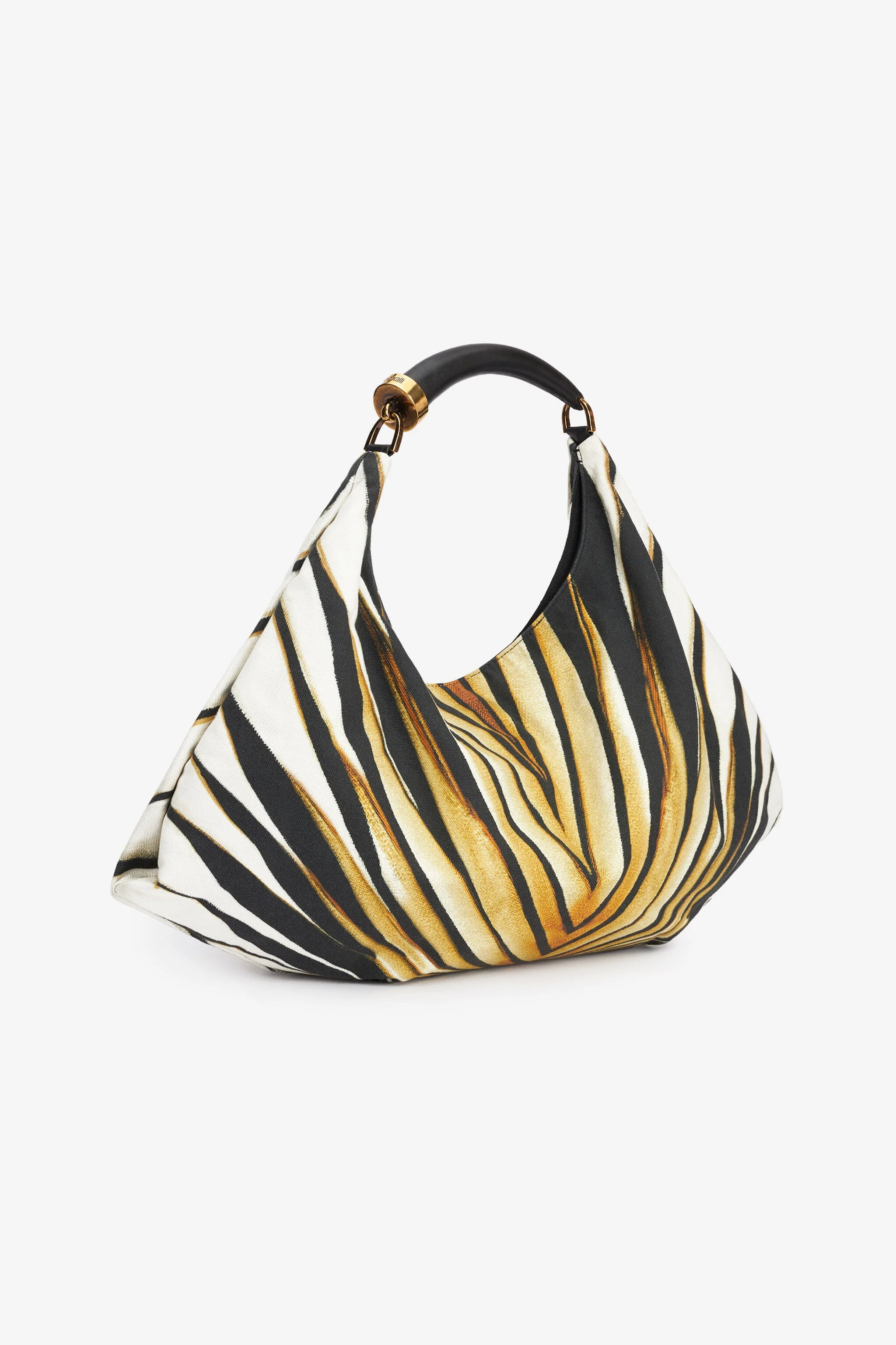 ID: TKB006-SMC00-T0047 Capture the light and the bold essence of Roberto Cavalli with this shoulder bag featuring the Ray of Gold print. An impactful accessory that merges a vibrant motif inspired by the wild with sophisticated design. The soft yet defined silhouette and structured handle create a fascinating contrast, making it a distinctive piece to elevate any look with a touch of unmistakable luxury. Details - Distinctive shoulder bag design - Crafted primarily from durable cotton canvas - Features a contrasting structured handle in fine leather - Accented with refined antique gold-tone hardware - Showcases the iconic Ray of Gold print - Spacious enough for daily essentials - Ideal for adding a bold statement to day or evening ensembles - Pair with neutral tones or coordinate with other Ray of Gold pieces for a complete look - Made in Italy - 64x54x3 Care & maintenance Leather - Fur:Ovis Aries Aries / External fabric:100% Cotton / Lining:97% Cotton, 3% Elastane