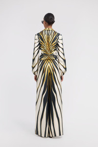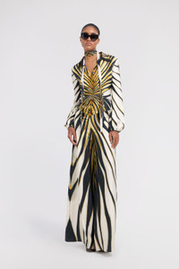 ID: TKT108-4QM33-01080 Radiate bold elegance with the Ray of Gold silk jumpsuit. The dynamic print, a burst of golden light against an abstract zebra background, captures the eye and defines the silhouette. Crafted from pure, fluid silk, this jumpsuit offers a luxurious feel and graceful movement. A statement piece embodying the unmistakable Roberto Cavalli aesthetic. The model is 178 cm / 5'10" tall and wears size S / 40 IT. Details - Elegant jumpsuit design - Crafted from exquisite pure silk for a luxurious feel - Features a classic collar and front button closure - Long sleeves with defined cuffs - Wide-leg trousers for a fluid silhouette - Exclusive all-over Ray of Gold print - Ideal for sophisticated evening events or special occasions - Pair with heeled sandals and minimalist gold jewellery - Made in Italy Care & maintenance External fabric:100% Silk