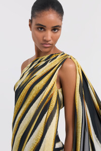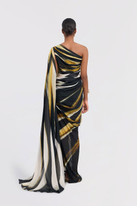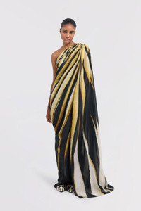 ID: TKT106-CTM33-01080 Capture the light with the Ray of Gold maxi dress, a draped masterpiece in pure silk. The print evokes golden rays against a deep background, creating a dynamic and captivating visual effect. The one-shoulder design adds a touch of modern sensuality, while the fluid silk gracefully caresses the figure with ethereal grace. A piece that embodies bold elegance, perfect for making an unforgettable impression. The model is 178 cm / 5'10" tall and wears size S / 40 IT. Details - Empire line maxi dress - Crafted from luxurious, fluid silk - Asymmetric one-shoulder design - Features elegant draping - All-over 'Ray of Gold' print - Ideal for evening events and ceremonies - Pair with jewelled sandals and a minimal clutch - Made in Italy Care & maintenance External fabric:100% Silk