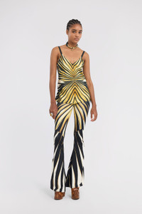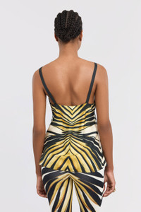 ID: TKT600-4QM33-01080 Radiate bold elegance with this silk top adorned with the Ray of Gold print. The design captures light and attention, featuring graphic patterns converging towards the V-neckline. Crafted from pure silk, it caresses the skin with luxurious fluidity, while the thin straps add a delicate touch. A piece embodying Roberto Cavalli's vibrant aesthetic, perfect for those who wish to stand out. The model is 178 cm / 5'10" tall and wears size S / 40 IT. Details - Camisole style top - Crafted from luxurious 100% pure silk - Features the graphic Ray of Gold print - V-neckline - Adjustable spaghetti straps - Perfect for evening looks or impactful daytime pairings - Pair with matching trousers for a bold total look - Made in Italy Care & maintenance External fabric:100% Silk