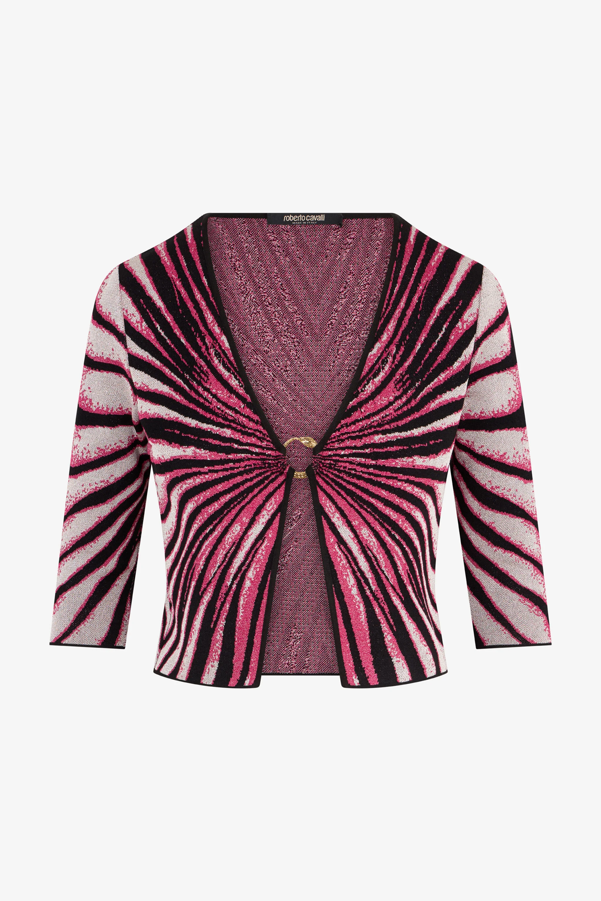 ID: XKM600-MI150-03020 Ignite your wardrobe with the radiant energy of the Ray of Paradise print. This captivating cardigan features an abstract, sunburst-like pattern in vibrant pink, deep black, and shimmering silver lurex. The design converges at a central gold-tone ring, creating a flattering focal point and a silhouette that is both bold and sophisticated. A piece designed to illuminate any occasion, it embodies the fearless glamour synonymous with Roberto Cavalli. Details - Cropped jacquard knit cardigan - Crafted from a stretch viscose blend with shimmering metallic yarns - All-over Ray of Paradise print - V-neck design with a central gold-tone ring fastening - Three-quarter length sleeves - Perfect for elevating an evening ensemble or for a special occasion - Pair it with high-waisted trousers or a pencil skirt to enhance its cropped silhouette - Made in Italy Care & maintenance External fabric:82% Viscose / Rayon, 11% Metal - Metallic - Metallised, 7% Polyester