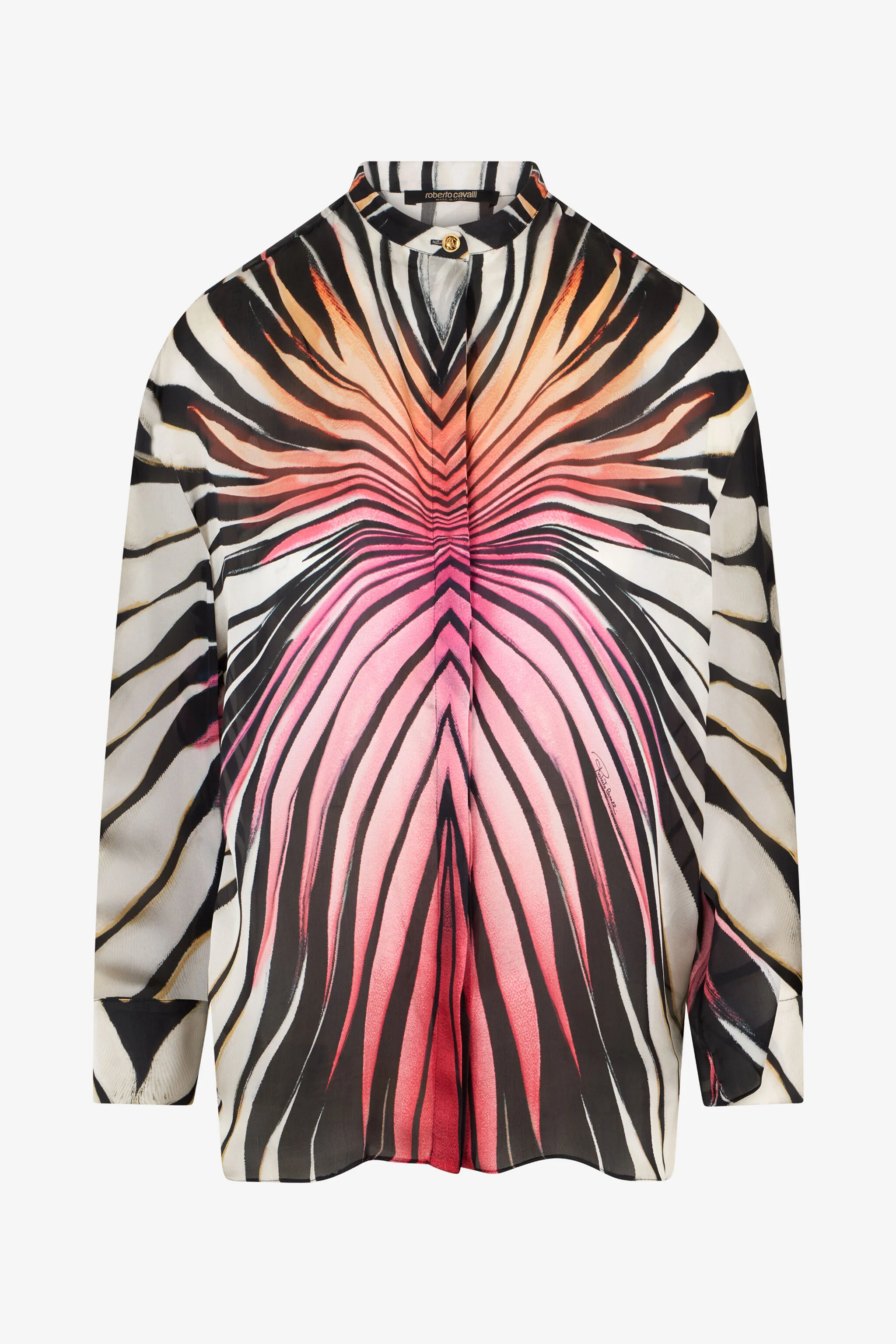 ID: XKT700-CTM33-01510 Evoking the explosion of colour of a tropical dawn, the Ray of Paradise print transforms this shirt into an artistic canvas. Crafted from pure silk, its fluid silhouette caresses the body, while the bold, radiant design captures the essence of an exotic paradise. A garment that embodies a vibrant and self-assured femininity, perfect for those who are not afraid to stand out with style and sophistication. Details - A signature piece that blends luxury and cutting-edge design. - Crafted from pure silk for an incomparably fluid and lightweight feel. - Mandarin collar and concealed buttoning for a clean, modern finish. - The central placement of the print is designed to enhance the figure. - Ideal for an exclusive event or to elevate a daytime look. - Pair with solid-coloured palazzo pants for a high-impact visual outfit. - Made in Italy. Care & maintenance External fabric:100% Silk
