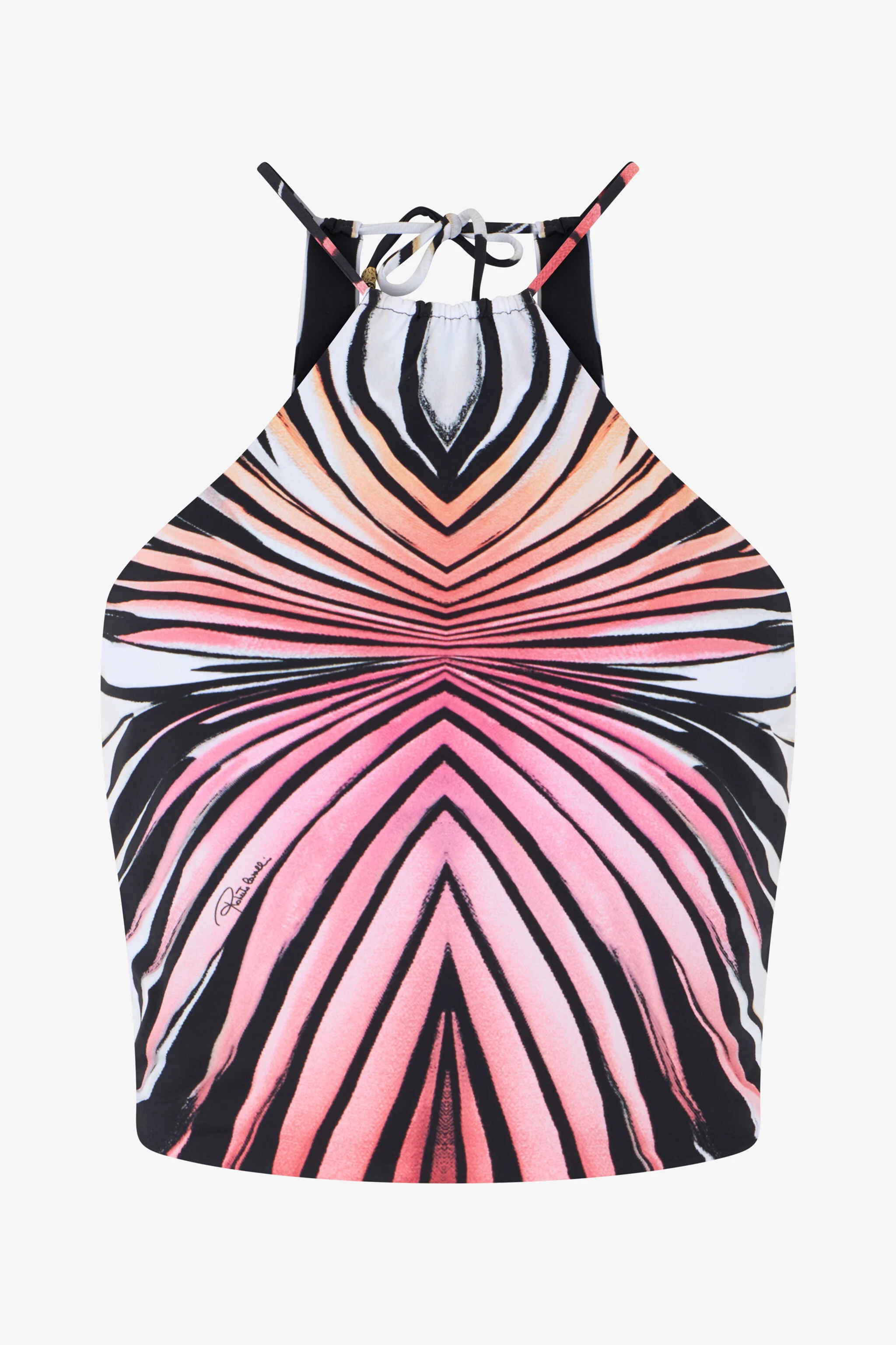 ID: XKW030-OOM33-01510 Capture the essence of a tropical sunset with the Ray of Paradise top. Its vibrant, symmetrical pattern radiates energy and bold sophistication, creating a hypnotic visual effect. The design gracefully enhances the silhouette, evoking the allure of exotic destinations and sun-drenched afternoons. This piece is a statement of confident femininity, designed for unforgettable moments by the water. Details - Halter neck design with self-tie closure at the back of the neck - Features the vibrant, all-over Ray of Paradise print - Adorned with a discreet Roberto Cavalli signature within the print - Crafted from a comfortable stretch fabric ideal for swimwear - Perfect for creating a standout look at the beach or by the pool - Complete the set by pairing it with the coordinating Ray of Paradise bikini bottoms - Made in Italy Care & maintenance External fabric:83% Polybutylene terephthalate, 17% Elastane / Lining:73% Polybutylene terephthalate, 27% Elastane