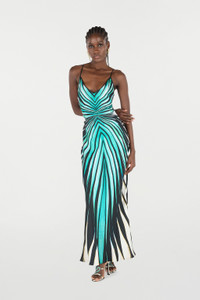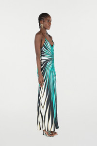 ID: VKT102-4QM33-04505 Immerse yourself in ethereal elegance with this silk maxi dress, brought to life by the vibrant Ray of Sea print. The fluid silhouette caresses the body, while the deep V-neckline and daring open back with crossed straps add a seductive touch. A design masterpiece evoking the beauty of the seabed, perfect for unforgettable evenings. The model is 178 cm / 5'10" tall and wears size S / 40 IT. Details - Ray of Sea print maxi dress - Crafted from luxurious pure silk - Deep V-neckline - Thin spaghetti straps crossing at the open back - Fluid, floor-length silhouette - Ideal for summer galas or exclusive evening events - Pair with metallic sandals and statement earrings - Made in Italy Care & maintenance External fabric:100% Silk