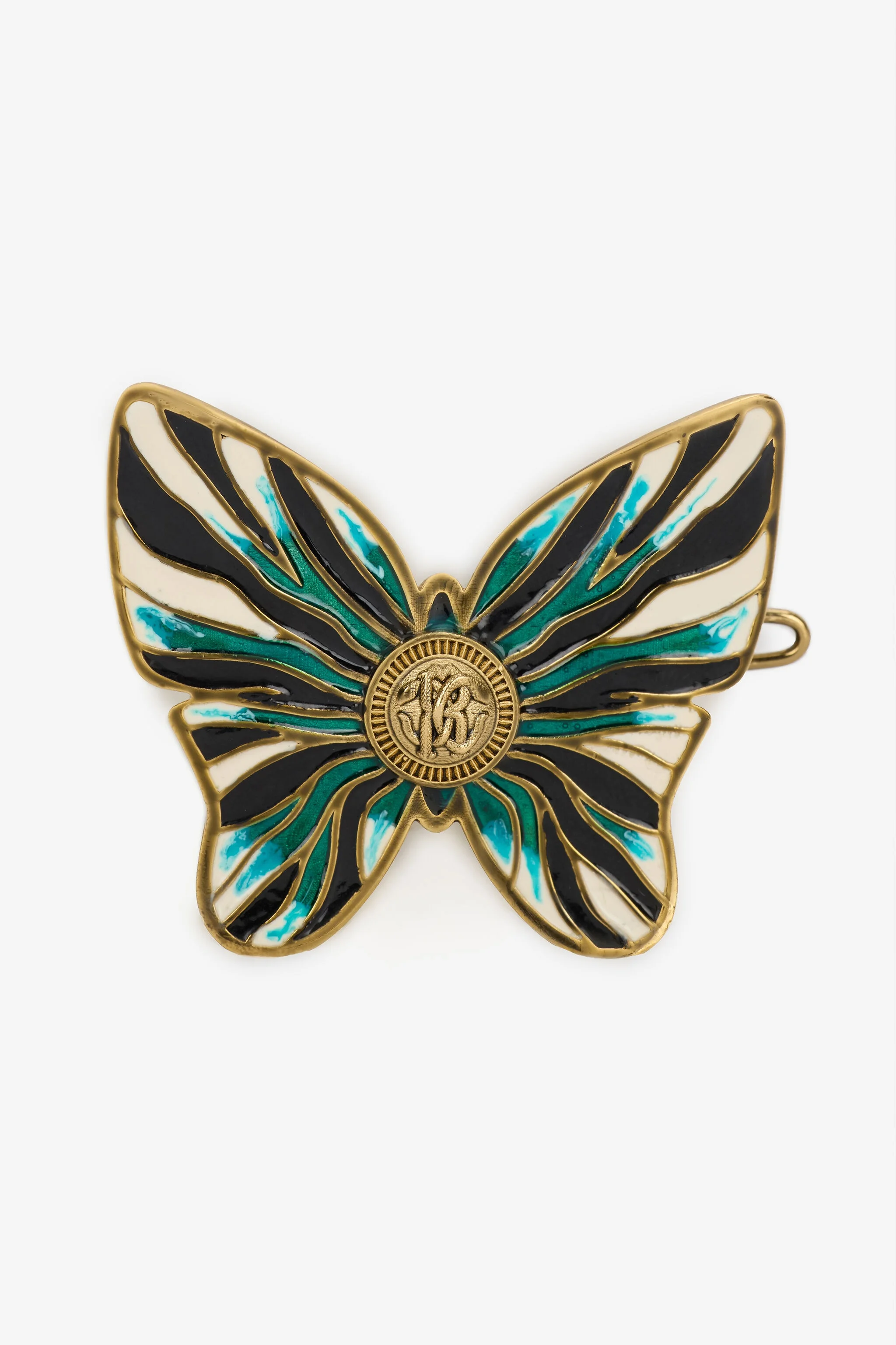 ID: VKG003-AM021-T1011 Capture the vibrant essence of the ocean with the Ray of Sea hair clip. This exquisite gold-tone metal butterfly is adorned with colourful enamel evoking sunlit water reflections, centred by the iconic RC Monogram. An accessory that adds a touch of luxurious metamorphosis and maritime charm to any hairstyle. Details - Butterfly-shaped hair clip - Gold-tone finished metal - Multi-coloured enamel decoration with Ray of Sea pattern - Central RC Monogram detail - Clip fastening on the back - Perfect for adding a distinctive touch to updos or half-up styles - Ideal for special occasions or elevating a daytime look - Pair with other Ray of Sea collection accessories for a coordinated look - Made in Italy
