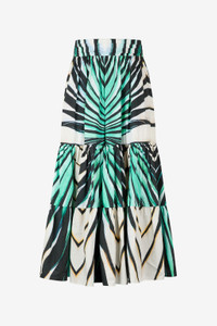 ID: VKT300-RLM33-04505 Immerse yourself in the vibrant energy of summer with the Ray of Sea print skirt. This captivating piece features cascading tiers that create beautiful movement with every step. The striking palm leaf pattern, rendered in vivid green, black, and white, transports you to sun-drenched shores. Crafted for elegance and comfort, this skirt is a statement of sophisticated warm-weather style. The model is 178 cm / 70 inches tall and wears size S / 40 IT. Details - Ray of Sea print - Midi length with tiered construction - Flared silhouette - Crafted from breathable cotton - Comfortable gathered high waist - Convenient side pockets - Perfect for summer days and vacation getaways - Pair with the matching top or a solid colour blouse - Made in Italy Care & maintenance External fabric:100% Cotton