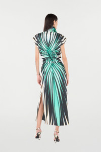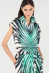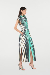 ID: VKT105-RLM33-04505 Capture the vibrant essence of summer with the Ray of Sea cotton shirt dress. The dynamic print, inspired by rays filtering through the sea, creates a striking visual effect in shades of green, black, and white. The midi silhouette, defined by a waist belt and side slits, offers effortless and contemporary elegance. A piece that evokes bright days and sophisticated evenings. Details - Shirt dress with a midi silhouette - Crafted from pure, breathable cotton - Features the all-over 'Ray of Sea' graphic print - Classic collar and cap sleeves - Matching belt to define the waist - Side slits for added movement - Perfect for daytime events or chic vacations - Pair with flat sandals or sculptural heels - Made in Italy Care & maintenance External fabric:100% Cotton / Secondary fabric:100% Cotton