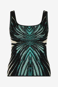ID: VKM611-MI150-04505 Capture the radiant essence of the sea with this top featuring the Ray of Sea print. The jacquard design creates a dynamic visual effect, with luminous reflections dancing on the fitted silhouette. The square neckline adds a modern and sophisticated touch, perfect for elevating any look. The model is 178 cm tall and wears size S / 40 IT. Details - Sleeveless top with Ray of Sea print - Crafted in jacquard knit with luminous details - Contemporary square neckline - Figure-hugging fit that enhances the silhouette - Ideal for special evenings or adding a touch of glamour to daytime looks - Pair with the matching skirt or sleek black trousers for a complete outfit - Made in Italy