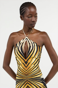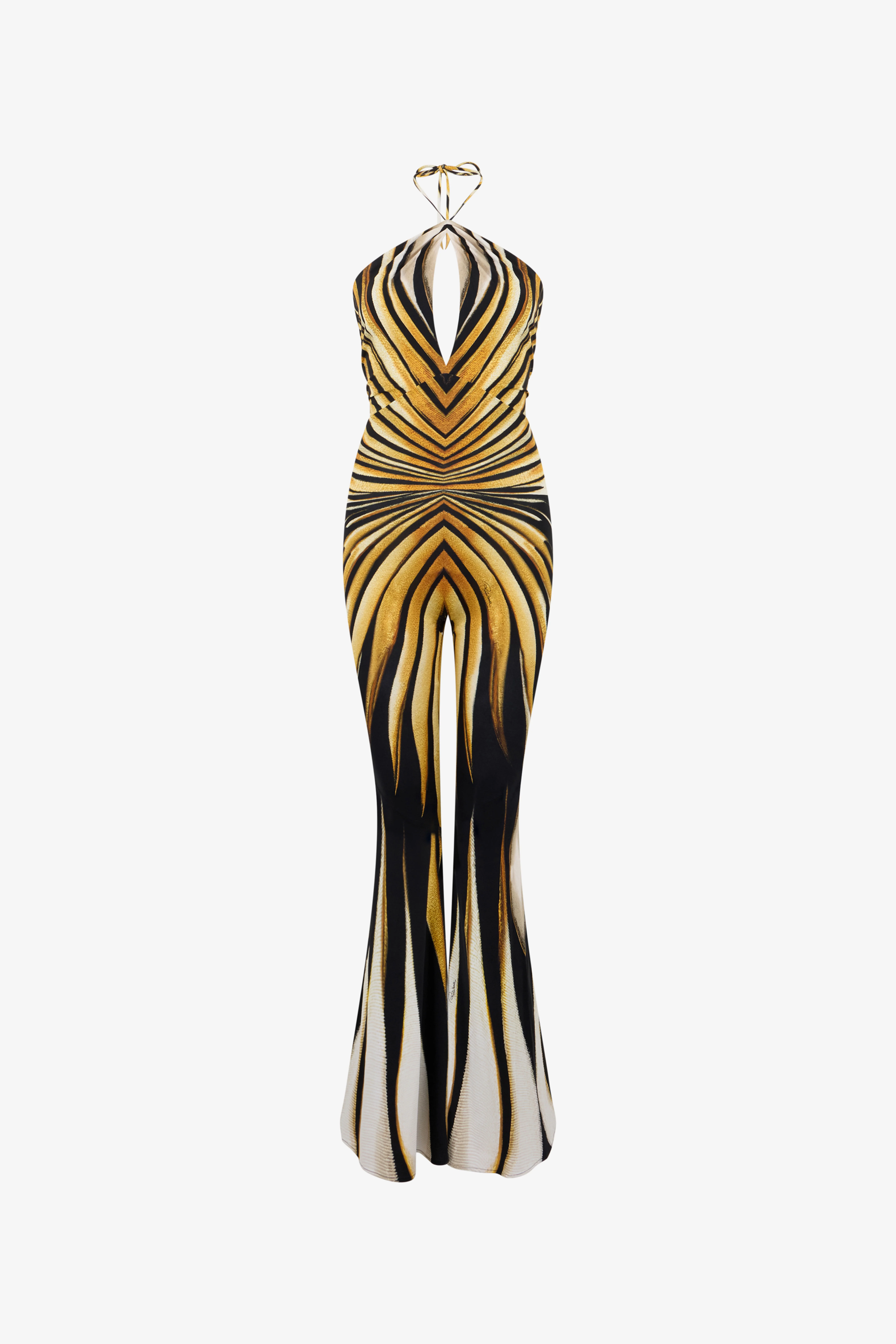 ID: VKT128-LNM33-01080 Emanating pure energy and magnetic allure, the Ray of Gold jumpsuit is a masterpiece of dynamic design. The hypnotic print radiates across the silhouette, accentuating every curve before flaring into a dramatic, flowing leg. A sophisticated halter neckline reveals the shoulders and an open back, creating a silhouette that is both powerful and sensuous. This piece is an ode to audacious femininity, designed for unforgettable entrances. The model is 178cm / 5'10" tall and wears a size S / 40 IT. Details - Halter neck jumpsuit - Fitted design with a keyhole cut-out detail at the bust - Flared leg for an elongated silhouette - Open back with a self-tie knot closure - Crafted from a stretch fabric for comfort and a perfect fit - Perfect for exclusive evenings, cocktail parties, or special events - Pair with high-heeled sandals and a minimalist clutch for an impactful look - Made in Italy Care & maintenance External fabric:86% Polybutylene terephthalate, 14% Elastane