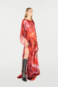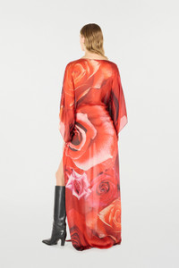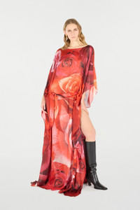 ID: UKT180-CTN48-02000 Express your romantic spirit with this pure silk long dress by Roberto Cavalli featuring a refined all-over maxi rose print, while the deep side slit and wide long sleeves with asymmetrical hem give the design an extra touch of sensuality. Details - Long pure silk dress - All-over maxi-rose print - Long full sleeves with asymmetrical hem - Deep side slit Care & maintenance External fabric:100% Silk