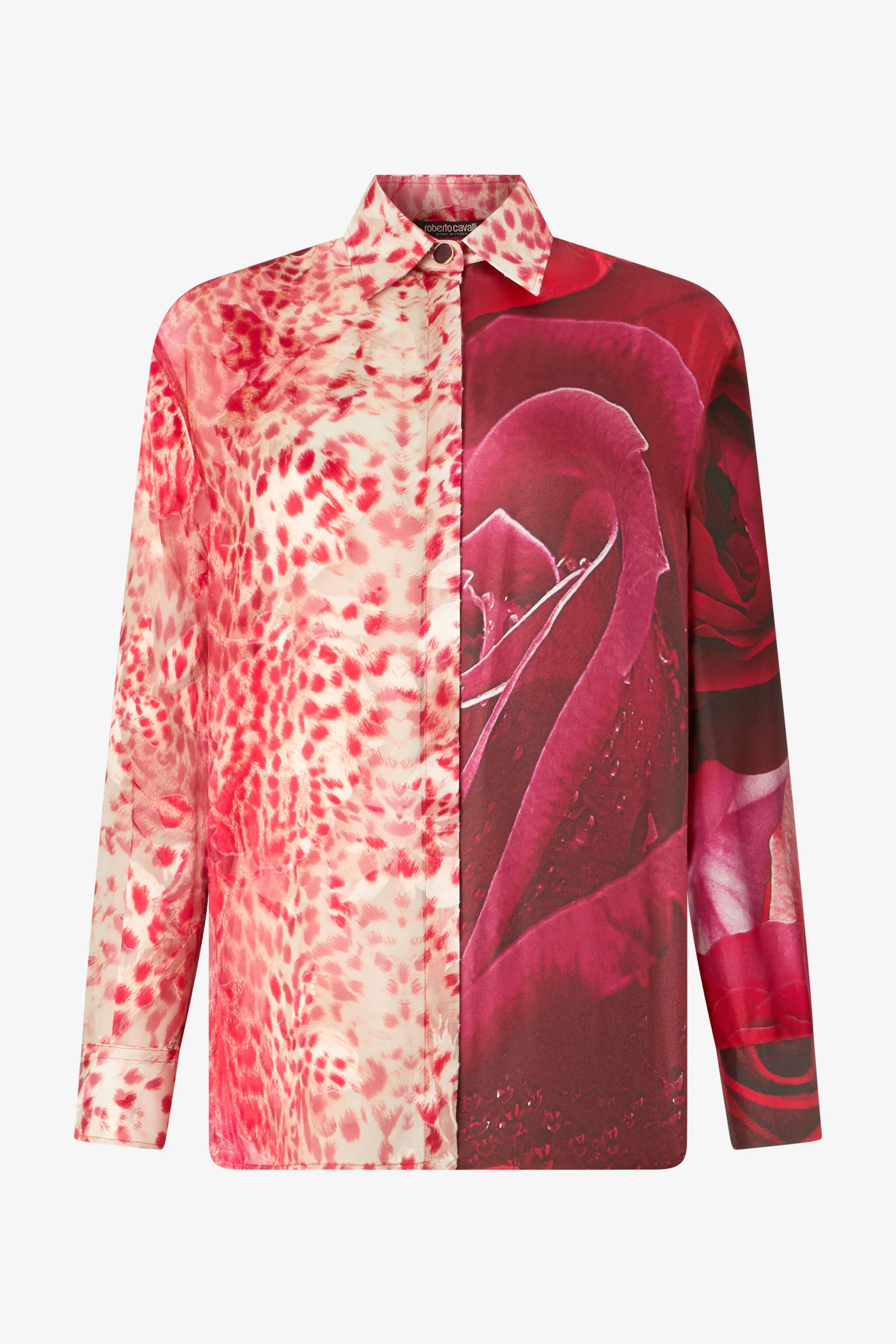 ID: UKT704-4QN48-D1989 This shirt with a minimalist design is enlivened by an original contrasting effect: a romantic print with maxi roses comes together with the wild soul of the Jaguar Skin motif, an authentic tribute to the Maison's distinctive style. Details - Shirt with maxi-rose and Jaguar Skin Print - Classic collar - Long sleeves - Concealed front fastening with exposed top button - Roberto Cavalli label on the inside collar Care & maintenance External fabric:100% Silk / Secondary fabric:75% Viscose / Rayon, 25% Silk