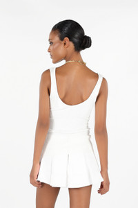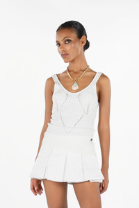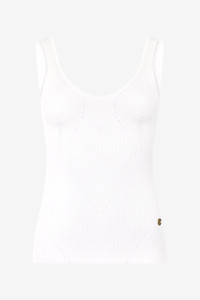 ID: UWM604-MH012-00064 The Wall print top is a versatile and elegant garment, perfect for adding a touch of sophistication to your look. The ribbed design creates a fitted and comfortable silhouette, while the V-neck enhances the decollete. The model is 178 cm tall and wears size S / 40. Details - Vertical ribbed design for a close fit - V-neck - Knitted geometric pattern - Made in: Italy - Perfect to wear alone or under a jacket for a more sophisticated look - Ideal for a casual-chic outfit or an elegant evening