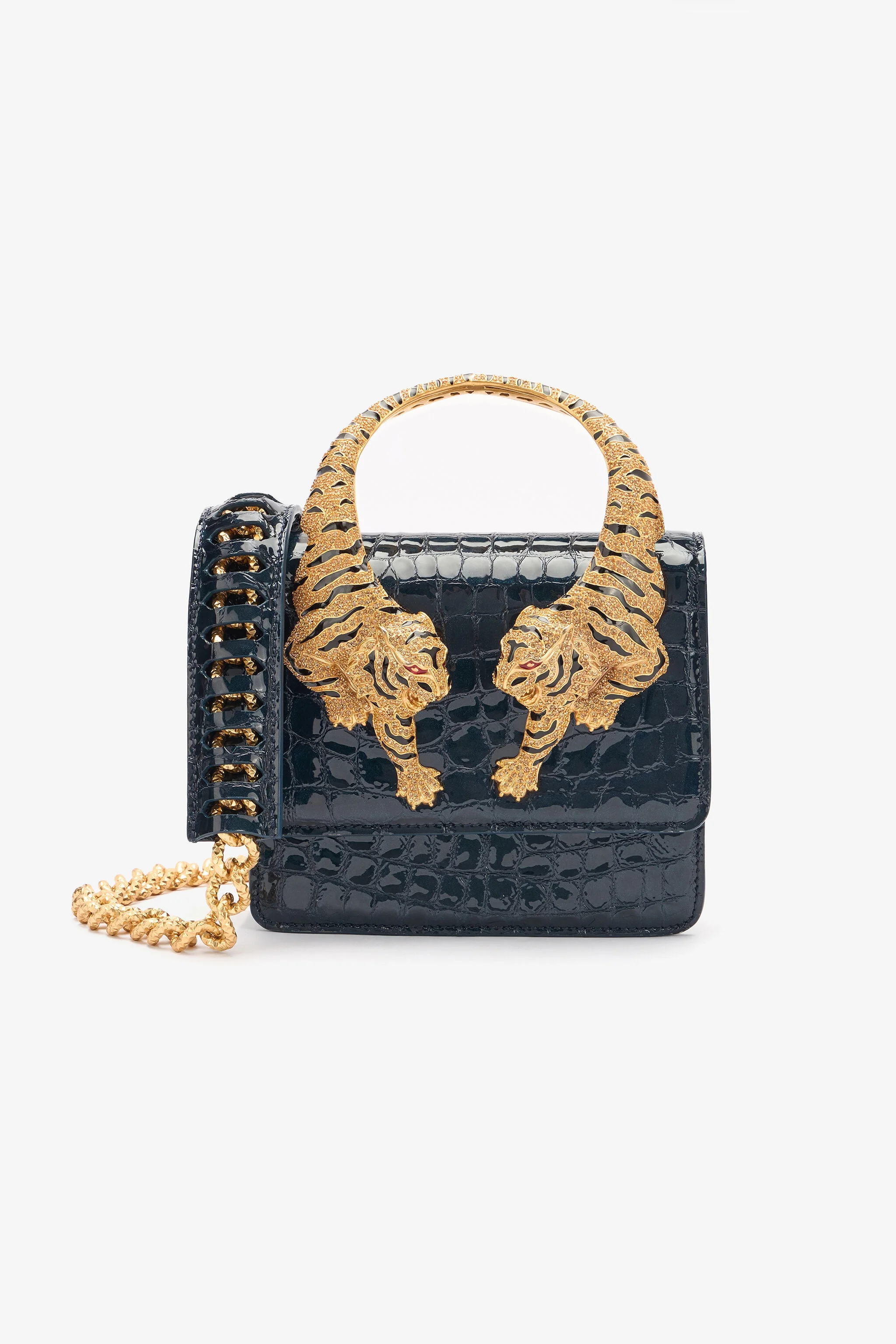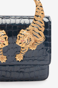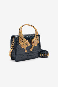 ID: SKB023-PZE01-D0058 This bag, made from genuine leather with crocodile scale-effect embossing, celebrates the DNA of the Roberto Cavalli Maison thanks to the logo on the back and the two crystal-studded tigers that form the top handle. The design, featuring a flap fastening, is complemented by a removable shoulder strap with a finely crafted chain and comfortable leather shoulder pad to allow it to be carried over the shoulder or by hand. Details - Crocodile scale-effect leather bag - Handle on top formed by bejeweled tigers - Flap with press-stud - Clasp-removable chain strap with laminated leather shoulder pad - Can be carried over the shoulder or by hand - Inside label with Roberto Cavalli logo - Lined interior - Made in Italy Care & maintenance Leather - Fur:Bos Taurus / Lining:60% Polyester, 40% Polyurethane
