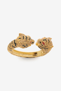 ID: UKG009-AM061-D3450 The feline pride that has always inspired the Roberto Cavalli Maison creations animates this bangle featuring two tiger heads facing each other at the ends. The sumptuous gold-colored finish and the surface entirely studded with crystals give this piece of jewelry a regal touch. Details - Bangle with bejeweled tiger heads - All-over set crystals - Golden and enameled finish - Double spring opening Care & maintenance Composition:Brass, Enamel, Glass