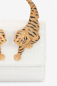 ID: SKB023-PZ975-05714 A shiny texture with crocodile scale-effect embossing and two tigers studded with crystals form the handle: this is how Roberto Cavalli pays tribute to its distinctive style in this leather bag, where the functional edge is provided by the removable, finely crafted chain strap with leather shoulder pad. On the back, the accessory is embellished with the Maison's signature logo. Details - Laminate leather bag with all-over crystals - Mini size - Handle on top formed by bejeweled tigers - Flap with press-stud - Clasp-removable chain strap with laminated leather shoulder pad - Can be carried over the shoulder or by hand - Inside label with Roberto Cavalli logo - Lined interior - Made in Italy - Measures 18,5x15,5x7,5 cm Care & maintenance Leather - Fur:Bos Taurus / Lining:60% Polyester, 40% Polyurethane