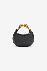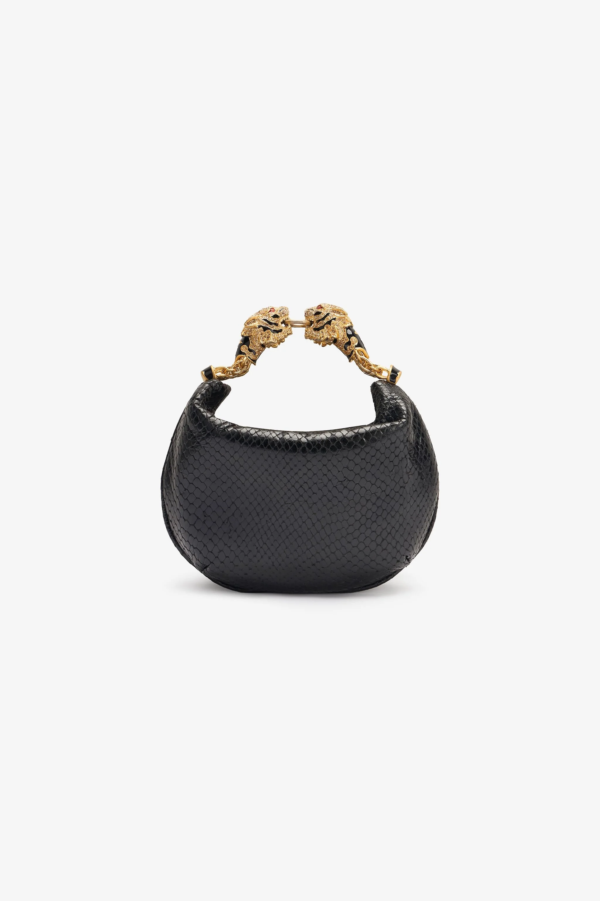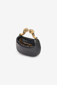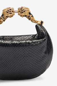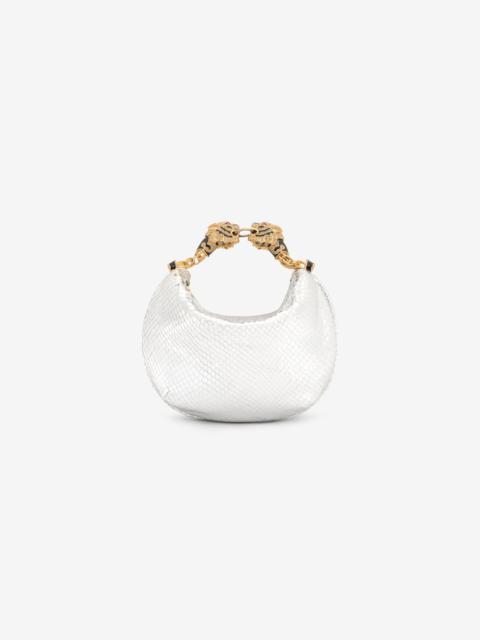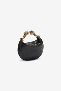 ID: UKB013-PZ579-D0007 A mini representation of the Maison’s most captivating stylistic details, this hobo bag is crafted from genuine leather with snake scale-effect embossing and is finished with the signature Roberto Cavalli logo on the front. The small top handle crafted from two fierce tiger heads studded with crystals attests to the constant attention to detail, while the interior lined with the iconic Jaguar Skin print recalls the brand's passion for animal motifs. Details - Snake scale-effect leather hobo bag - Mini size - Roberto Cavalli logo on the front - Top handle formed by bejeweled tiger heads - Can be carried by hand - Top fastening with zipper - Lining with Jaguar Skin print Care & maintenance Leather - Fur:Aegagrus Hircus / Lining:97% Cotton, 3% Elastane