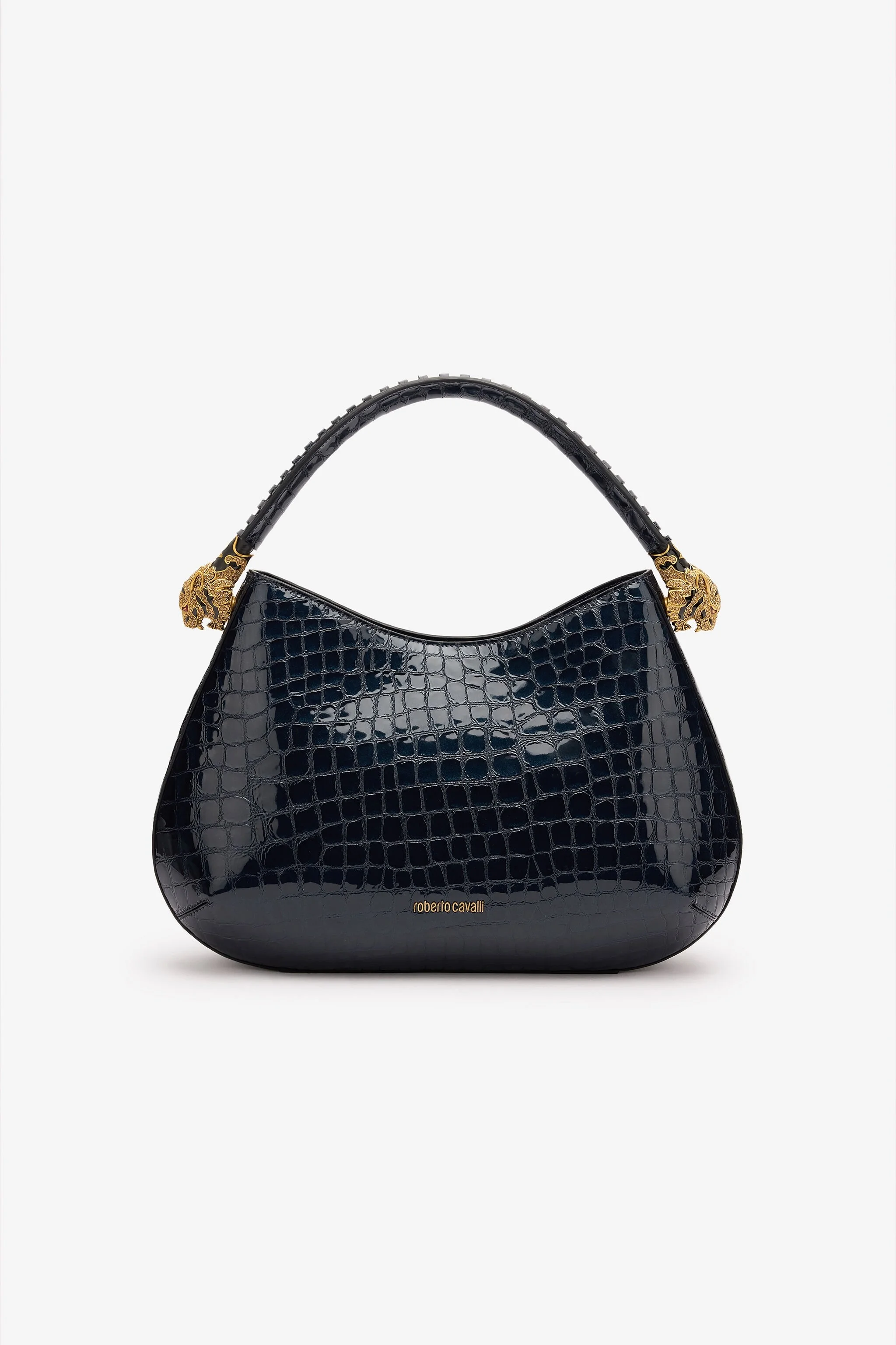 ID: TKB022-PZE01-D0058 This hobo bag, made from genuine leather with lush crocodile scale-effect embossing, celebrates the DNA of the Roberto Cavalli Maison thanks to the logo on the front and the two crystal-studded tigers that form the top handle. Details - Crocodile scale-effect leather hobo bag - Top handle with bejeweled tiger heads on tips - Roberto Cavalli logo on the front - Top opening - Cotton-blend lining Care & maintenance Leather - Fur:Bos Taurus / Lining:97% Cotton, 3% Elastane