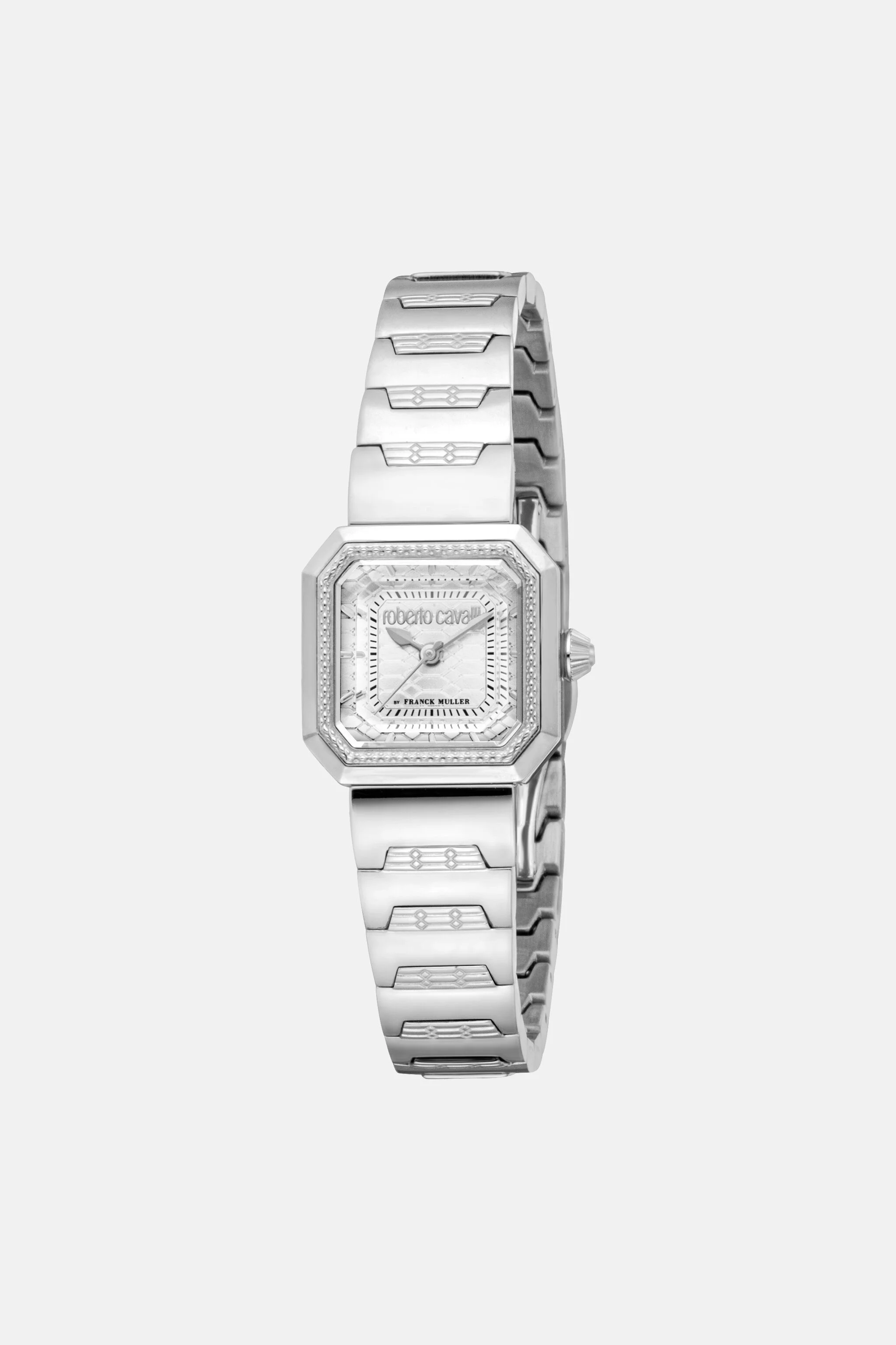 ID: UALT16-IT566-FM640 This Roberto Cavalli by Franck Muller timepiece embodies modern elegance with a bold, minimalist design. Its 22mm square stainless steel case encases a refined silver-tone dial, effortlessly combining contemporary style with timeless sophistication. Powered by Swiss quartz movement, this watch is a statement of everyday luxury—ideal for those who seek understated pieces with distinctive character. Details - Roberto Cavalli by Franck Muller Mini watch - 22 x 22 mm stainless steel case - Silver color dial - Stainless Steel bracelet - Bracelet with butterfly buckle fastening - 3 Hands watch - Functions: hours, minutes, seconds - Quartz watch with Ronda 753 Swiss movement - Water-resistant up to 30m (3 ATM) - 2 years international warranty excluding battery and wear to the case and strap or bracelet