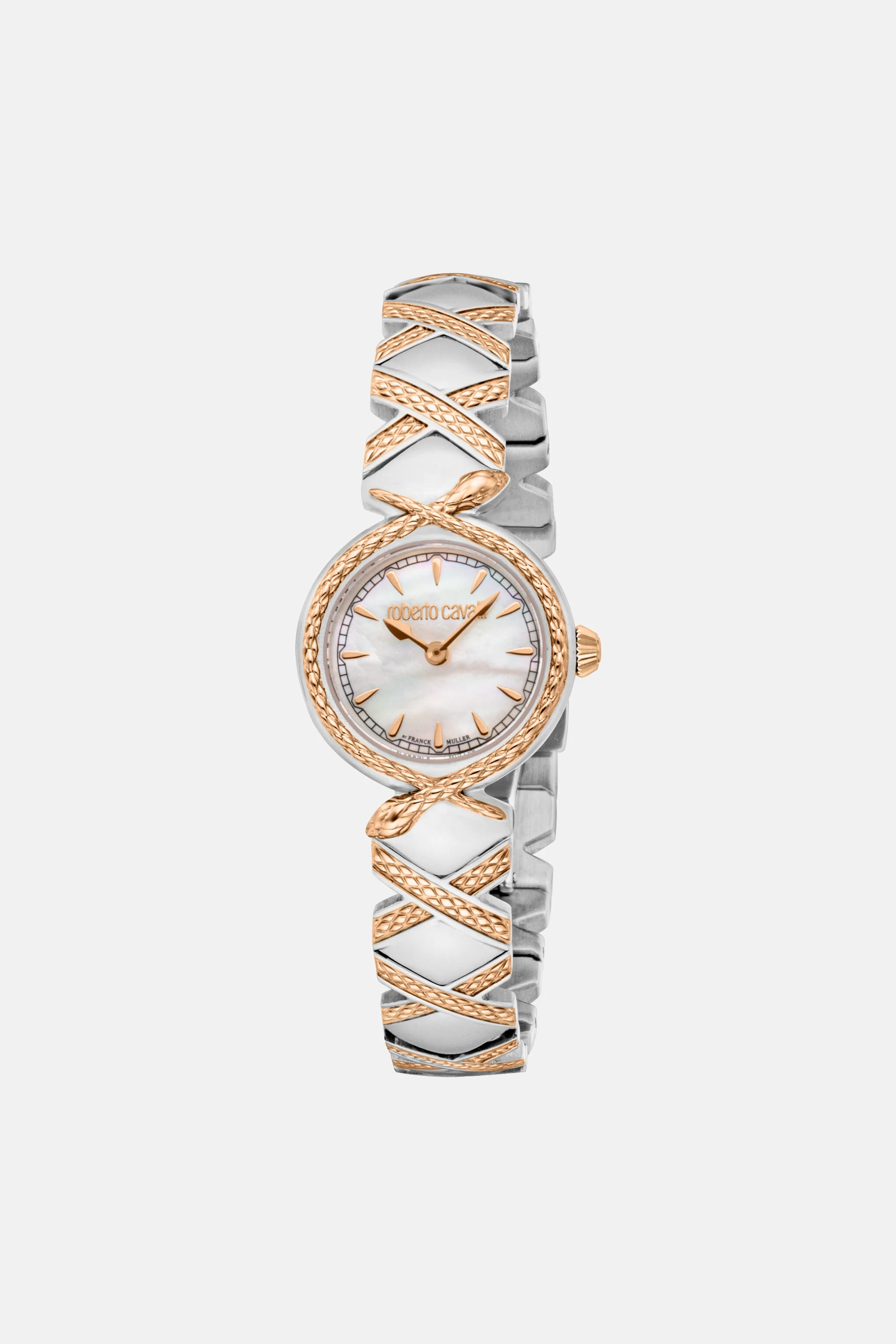 ID: UALT14-IT560-E0607 This bicolor 24mm Roberto Cavalli by Franck Muller Snake Core watch showcases a luminous white mother-of-pearl dial, adding a radiant touch to its elegant design. The distinctive snake coils around the case, seamlessly extending onto the bracelet for a bold, continuous effect. The delicate crossed pattern on the bracelet further enhances its sophistication, imparting a refined touch. A perfect blend of strength, beauty, and craftsmanship. Details - Roberto Cavalli by Franck Muller Snake Core watch - 24mm Stainless Steel case with Two Tone Silver and Rose Gold Color IP plating - Silver color dial with white mother-of-pearl - Stainless Steel bracelet with two tone silver and rose gold color IP plating - Bracelet with butterfly buckle fastening - 2 Hands watch - Function: hours, minutes - Quartz watch with Ronda 762 Swiss movement - Water-resistant up to 50m (5 ATM) - 2 years international warranty excluding battery and wear to the case and strap or bracelet