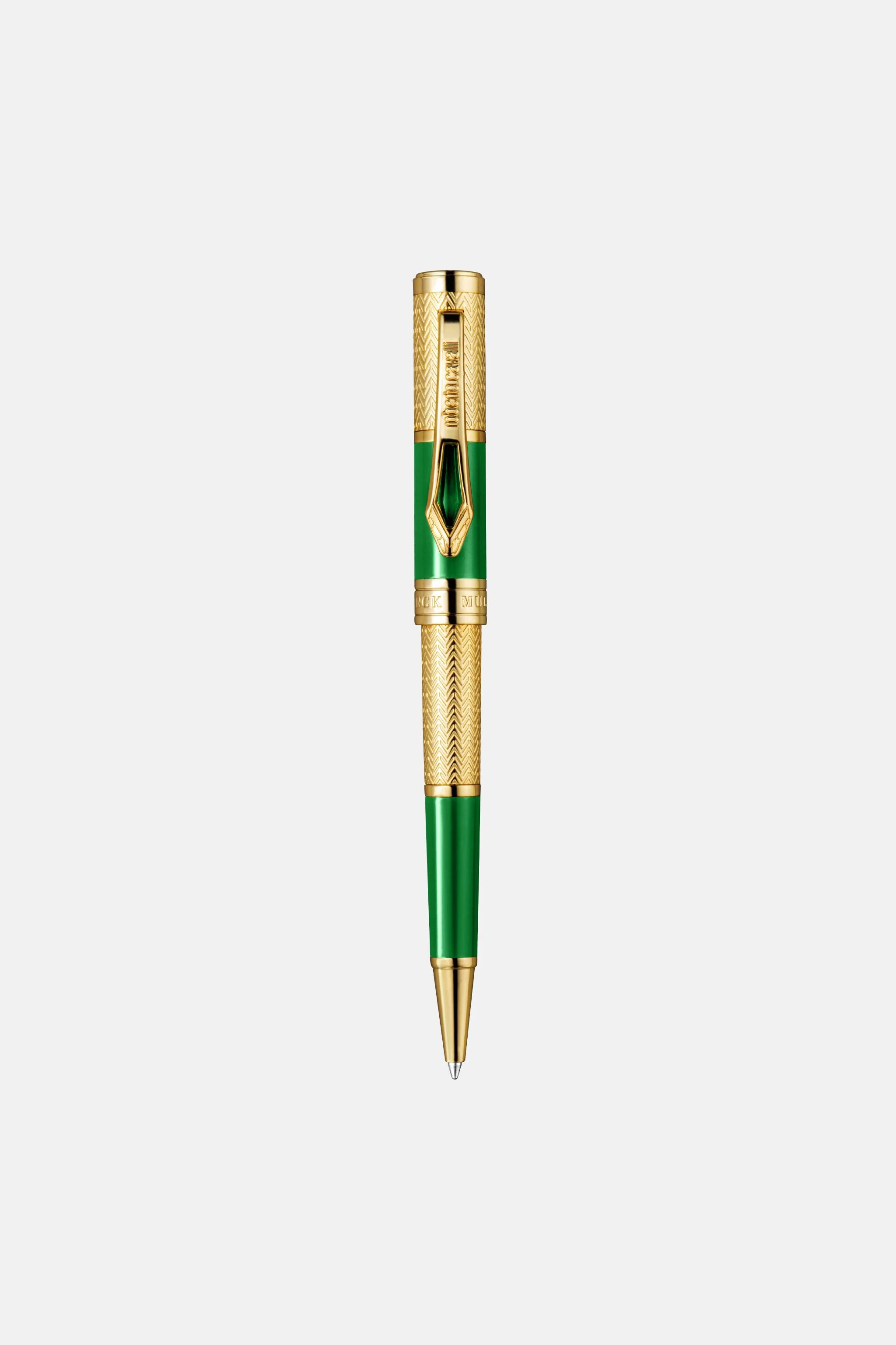 ID: VALG07-IG269-JC026 Make your mark with the Roberto Cavalli Chevron Ballpoint Pen. Crafted from brass and finished in radiant gold with a deep green lacquer, this writing instrument embodies refined strength and timeless allure. Both the upper and lower barrels are embellished with an intricate chevron pattern, creating a play of light and texture. The sculpted snake-head clip captures the Maison’s iconic symbol of power and transformation, while engraved logo details on the middle ring, clip, and cap top affirm its unmistakable Roberto Cavalli heritage. Filled with smooth black ink, this 143 × 13 mm pen delivers precision and style in perfect harmony: a bold statement of elegance for every signature. Details - Roberto Cavalli Pen - Brass made with gold color plated metal & green lacquer - Upper and lower barrels embellished with a chevron pattern - Snake head design on the clip - Engraved logo detail on the middle ring, clip and on the cap top - Writing instrument with black ink - Size: 143 x 13mm - Dressed in an elegant branded sleeve Care & maintenance Composition:Brass