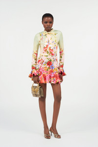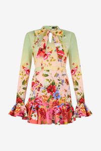 ID: WQT104-3AR32-D0509 A dress adorned with a floral pattern on a softly shaded background. The bow detail at the neckline and the ruffles on the sleeves add a touch of timeless elegance, turning every movement into a visual work of art. Details - Vibrant, all-over floral print - Soft pastel hues - Elegant bow at the neck - Refined ruffles at the sleeves - Figure-flattering silhouette