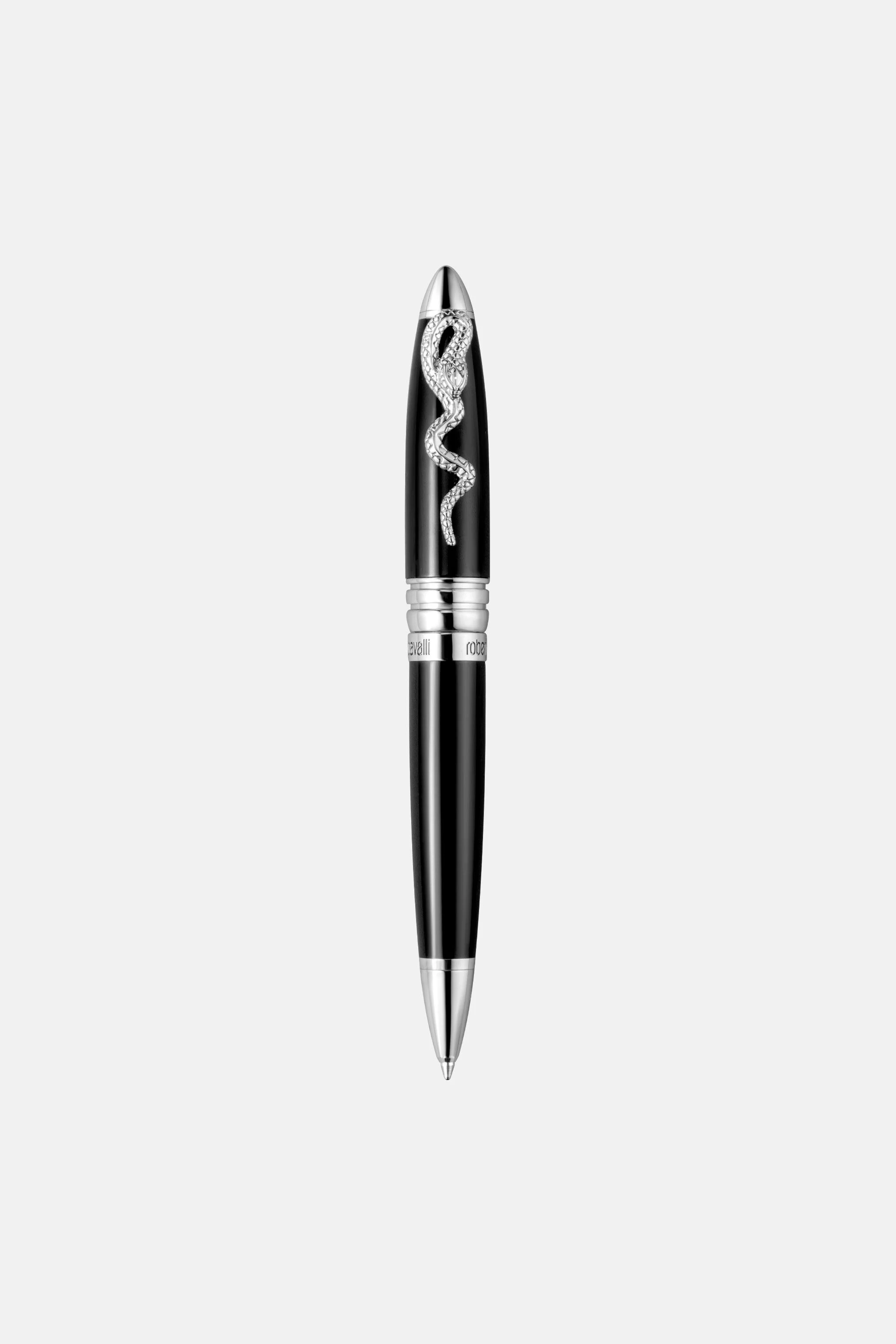 ID: SALT5H-IT407-FM640 Experience sophistication with every stroke using the Roberto Cavalli ballpoint pen. Meticulously crafted with polished black lacquer pieces and silver-tone metal, this pen exudes elegance. Its clip features a captivating snake design, symbolizing the essence of the Maison. Additionally, it is complemented by an engraved logo on the middle ring. Details - ROBERTO CAVALLI PEN - Brass made with silver color plated metal - Upper and lower barrel embellished with black lacquer - Iconic snake design on the clip - Engraved logo detail on the middle ring - Black ink - Size: 143 x 15mm - Dressed in an elegant branded sleeve Care & maintenance External fabric:100% Brass