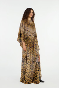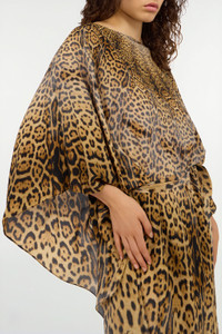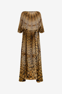 ID: VWT180-SQR80-00504 Bold, wild, and iconic: the Jaguar Skin print, a cornerstone of Roberto Cavalli's aesthetic, unfolds like a mantle over this long dress with three-quarter sleeves and a subtly bateau neckline crafted from pure silk. The piece is distinguished by its fluid, draped silhouette, accentuated by a skirt with soft pleats and a blouson top with a cinched waist and a matching sash to tie. Completing the dress is an additional nod to the Maison's DNA: small signature logos dispersed across the print's surface. Details - Long dress in pure silk - All-over Jaguar Skin print - Soft and flowing line - Wide three-quarter sleeves - Slightly boat-shaped neckline - Waist with gathered cut and coordinating sash - Small Roberto Cavalli signatures on the garment's surface - Roberto Cavalli label inside the collar Care & maintenance External fabric:100% Silk