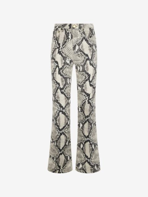 ID: VWJ221-DAQ75-05579 The wild elegance of the reptile world, which is a constant source of inspiration for Roberto Cavalli, comes to life in these five-pocket jeans, featuring the brand’s iconic all-over Python print. The wide-legged model, made of comfortable stretch cotton denim, is further customized by the branded tag on the back. Details - Stretch cotton denim jeans - All-over Python print - Five-pocket design - Front fastening with branded golden button - Wide leg - Belt loops - Branded tag on back
