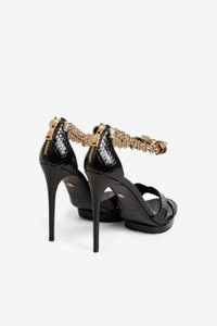 ID: FWS199-PA001-05051 This season, Swarovski crystals enhance the sensuality and femininity core to Roberto Cavalli’s footwear collection. The black python platform sandals are high-octane glamour at its best, and feature an intricately embellished panther and chain ankle strap. Details - Crystal-Embellished Panther Sandals - 120mm heel - Black and dark yellow Swarovski crystals - High stiletto heel - Back zip closure - Domestic shipping only - Made in Italy Care & maintenance Leather - Fur:Homalopsis Buccata / Lining:100% Capra hircus linneaus