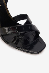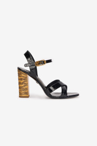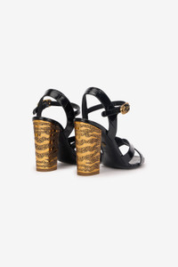 ID: VKS026-PZ579-05051 Elegance, boldness and originality are the keywords for these Roberto Cavalli sandals featuring iconic crocodile scale-effect embossing and a thick golden heel with an animal-inspired motif. The style features two crossed bands on the front and an adjustable ankle strap with a buckle defined by the iconic Mirror Snake Monogram, a further tribute to the reptile universe that has always fascinated the Maison. Details - Sandals with crocodile scale-effect embossing - Two crossed bands on the front - Ankle strap with buckle with Mirror Snake Monogram - Thick golden heel with animal-inspired motif - Roberto Cavalli label on the insoles - Metallic RC monogram under the sole - Made in Italy