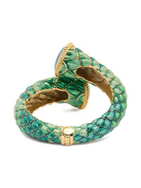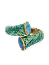 scaled cuff bracelet Highlights - Features a distinctive scaled design - Adorned with two vibrant circular stones - Finished with a golden edge detailing - Primarily in shades of green - Secure fastening detail for ease of wear Made in Italy