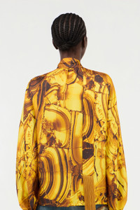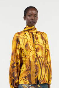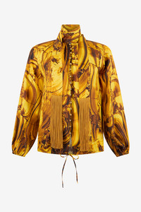 ID: VKT700-4QP74-D4162 Unleash your inner strength with this captivating shirt, adorned with the hypnotic Tigereye print. The design emulates the rich, layered beauty of the gemstone, creating a visual narrative of power and elegance. Crafted from a fluid fabric, it drapes beautifully over the form, while dynamic fringe details and a sophisticated tie-neck add a touch of untamed Roberto Cavalli glamour. This piece is not just a garment, but a statement of bold confidence. The model is 178cm / 5'10" tall and wears a size S / 40 IT. Details - Fluid silhouette shirt with an all-over print. - Crafted from pure silk, offering a luxurious and lightweight feel against the skin. - Features a sophisticated high neck with a self-tie lavalliere. - Elegant fringe inserts applied to the front. - Detailed with a concealed button closure and an adjustable drawstring at the hem. - Long balloon sleeves with elasticated cuffs. - Perfect for an exclusive event or to elevate a daytime look. - Pair it with tailored black trousers to let the print take centre stage. - Made in Italy.