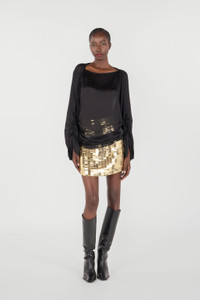ID: UKR307-OG028-05508 A smattering of sparkling golden appliques adorns this silk miniskirt by Roberto Cavalli, a glamorous and sensual garment that will take any look to the next level. Details - Silk miniskirt with gold appliques - Silk lining - Zipper fastening on back Care & maintenance External fabric:100% Silk / Lining:100% Silk / Embroidery - Decoration:80% Polyvinyl chloride, 10% Polyester, 10% Glass fibre