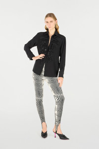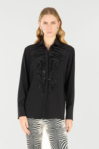 ID: UKR709-SY001-05051 This shirt with a clean and simple design by Roberto Cavalli is an authentic feminine wardrobe staple, embellished with the iconic Tiger Skin motif on the front formed by sparkling sequins. Details - Silk shirt - Sequined Tiger Skin design - Classic collar - Long sleeves - Concealed front fastening with exposed first button - Roberto Cavalli label on the inside collar Care & maintenance External fabric:100% Silk / Lining:100% Silk / Embroidery - Decoration:40% Polyvinyl chloride, 40% Glass fibre, 20% Polyester