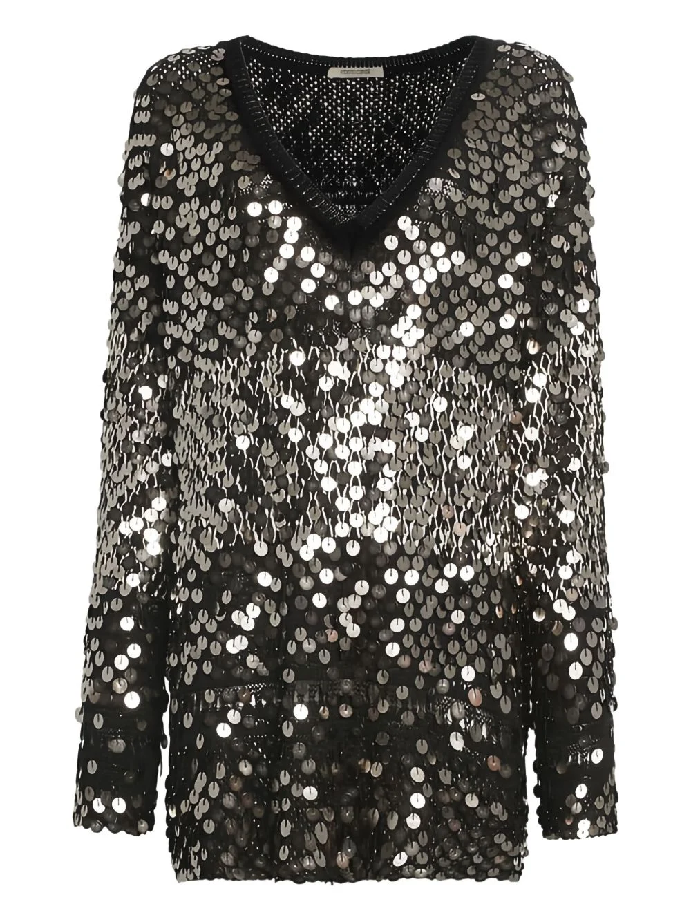 sequin-embellished sweater Highlights - Black and silver - V-neck - Long sleeves Made in Italy Composition Cotton 69%, Polyamide 24%, Polyester 7% Washing instructions Read Manufacturer Guidelines