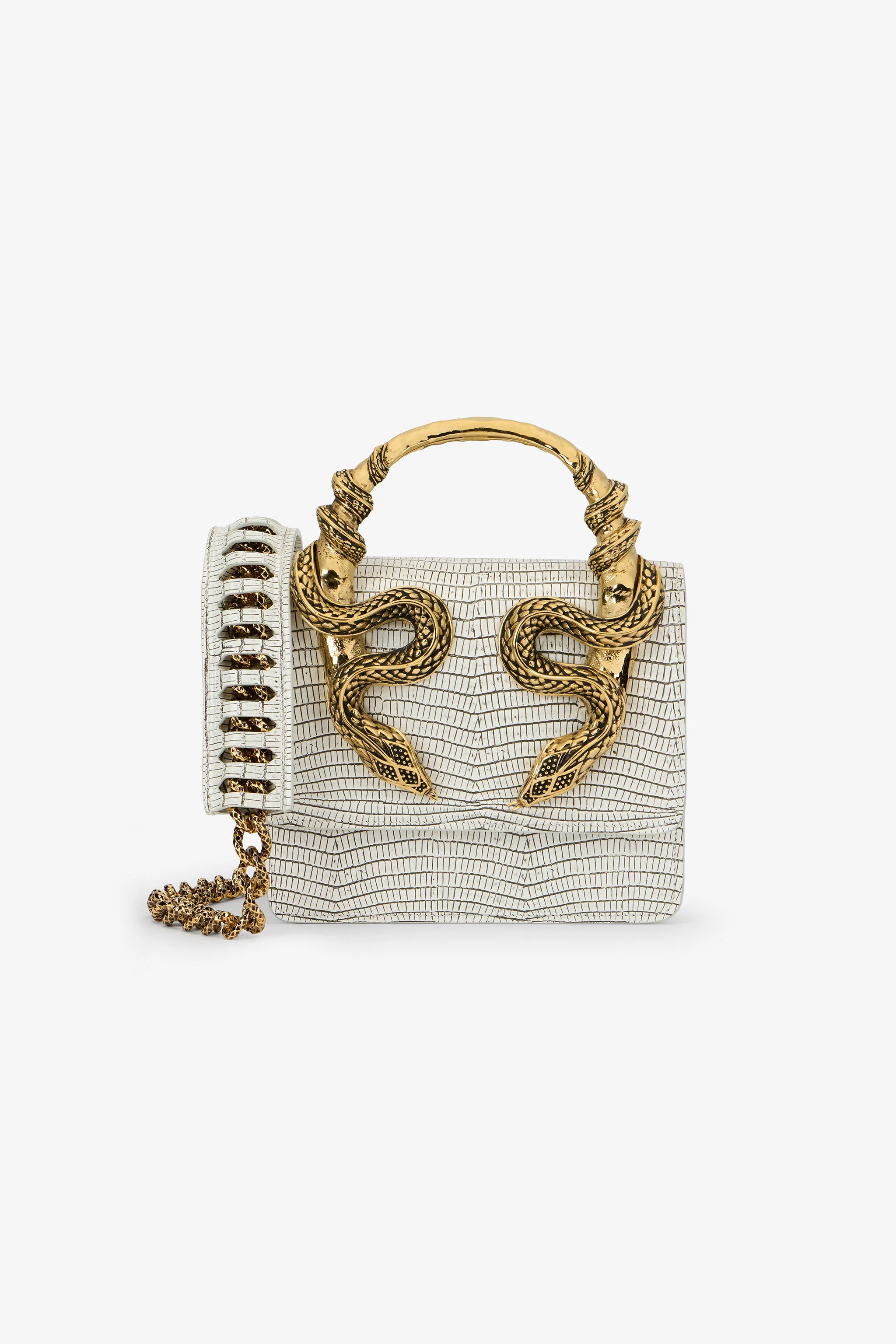 ID: VWB001-PZ119-00005 The reptile universe, which has always been a source of inspiration for Roberto Cavalli, finds full expression in this bold bag thanks to the cobra-effect texture and the two sinuous golden snakes that form the handle. The accessory, which has a flap fastening design, comes with a finely-crafted chain strap that can be removed with the clasps, allowing it to be carried by hand or over the shoulder. Details - Medium bag - Can be carried over the shoulder or by hand - Cobra-effect embossing - Top handle with twisted detailing and snakes - Chain shoulder strap with top strap, removable via clasps - Flap with magnetic button - Lined interior - Roberto Cavalli logo on the back Care & maintenance Leather - Fur:Bos Taurus / Lining:60% Polyester, 40% Polyurethane