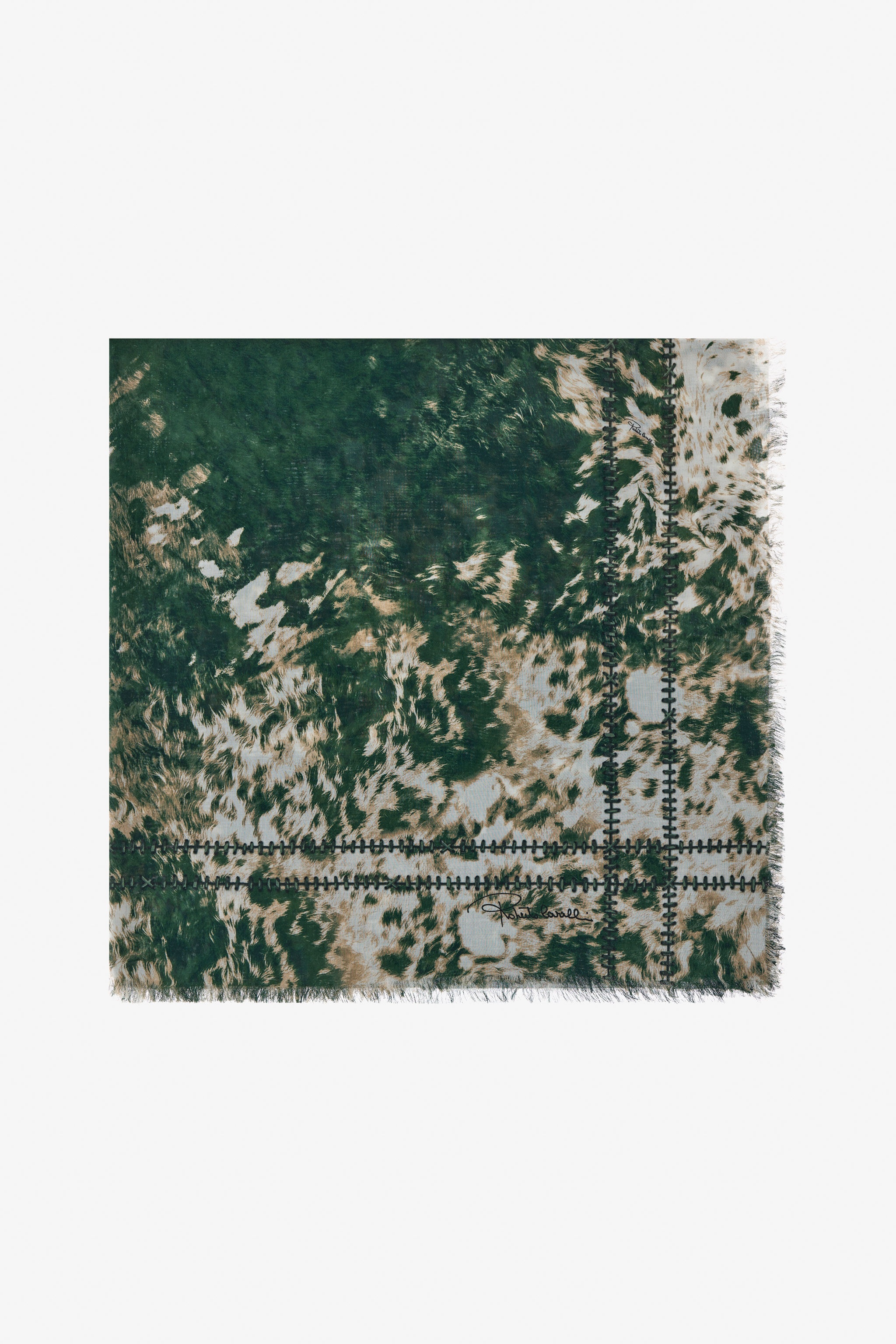 ID: TALR33-IR050-04050 Made of a cashmere blend, this shawl is an ode to the wild elegance of nature, expressed through the all-over Appaloosa print framed by a topstitching motif. The accessory is finished with the iconic Roberto Cavalli signature on one corner and slightly frayed edges. Details - Cashmere-blend shawl - All-over Appaloosa print with topstitching - Roberto Cavalli signature on one corner - Slightly frayed trims Care & maintenance External fabric:90% Modal, 10% Cashmere