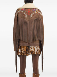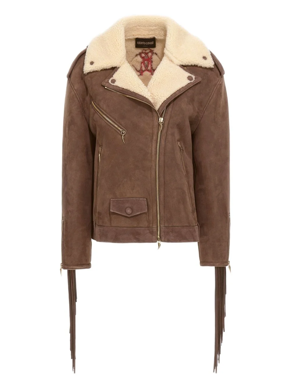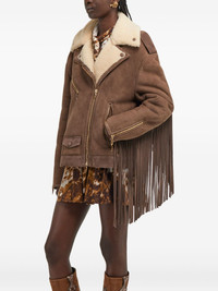 shearling-trimmed fringed leather jacket Highlights - Brown - Shearling collar - Zip fastening - Fringe detail - Asymmetrical zip-fastening - Leather construction Made in Italy Composition Ovine Leather (top grain) 100% Washing instructions Read Manufacturer Guidelines